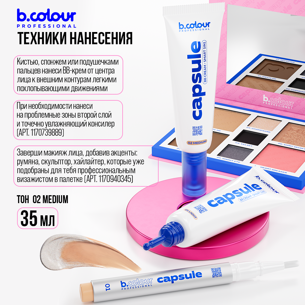 СохранитьB.COLOUR PROFESSIONAL BB крем для лица, тональный крем для лица увлажняющий, выравнивающий CAPSULE 02 MEDIUM интересное: