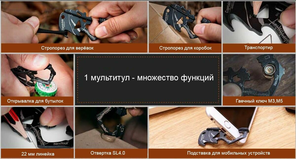 | Дополнительная информация | количество инструментов (функций): 7; материал инструмента: нержавеющая сталь; инструменты (функции) подробно: резак, отвёртка, шестигранные ключи М5 и М3, открывашка , подставка для смартфона; ширина: 42 мм |