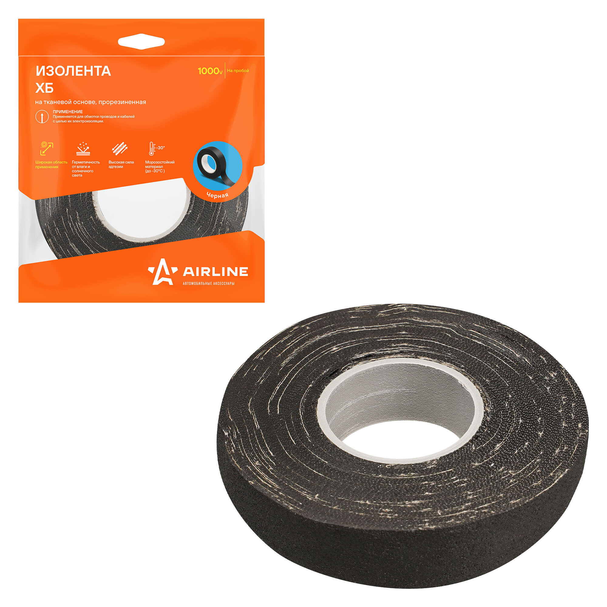 Изолента ХБ на тканевой основе, 200 г, прорезиненная, (19мм*0,4мм*16м), черная ADHB004 AIRLINE