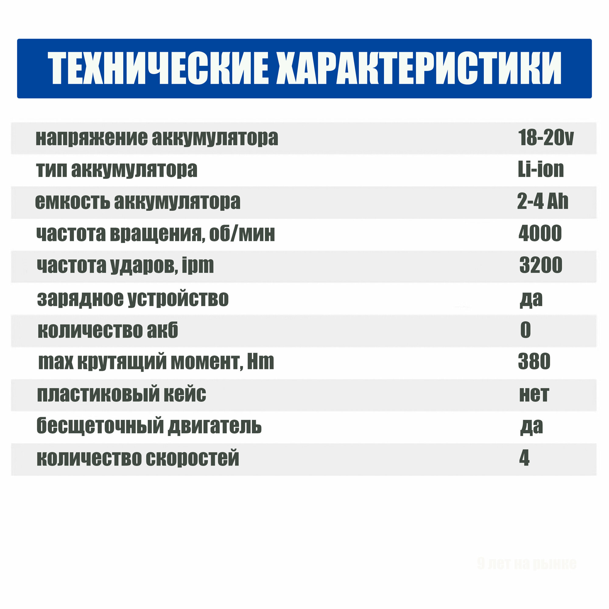 | Количество аккумуляторов в комплекте | без аккумулятора |