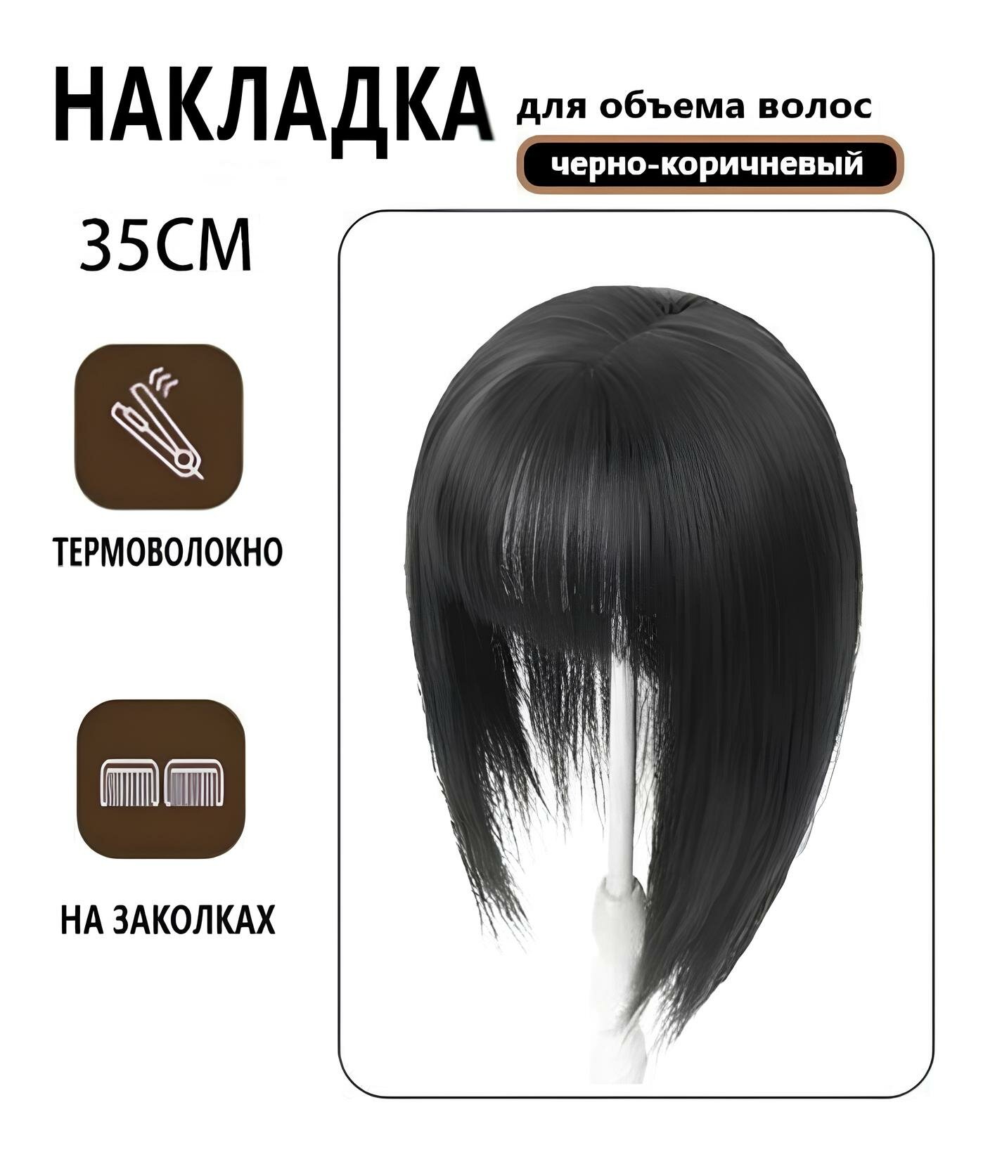 Накладка полупарик с челкой из волос для объема на теменную зону для женщин и девушек черно-коричневый 35 см.