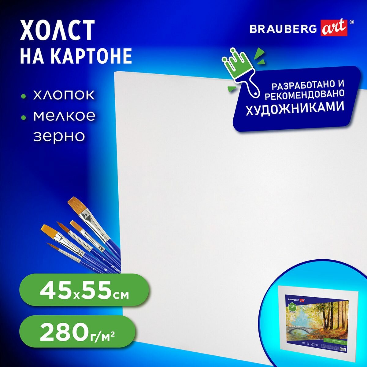 Холст на картоне BRAUBERG ART CLASSIC, 45х55 см, грунтованный, 100% хлопок, мелкое зерно, 191021 (арт. 191021)