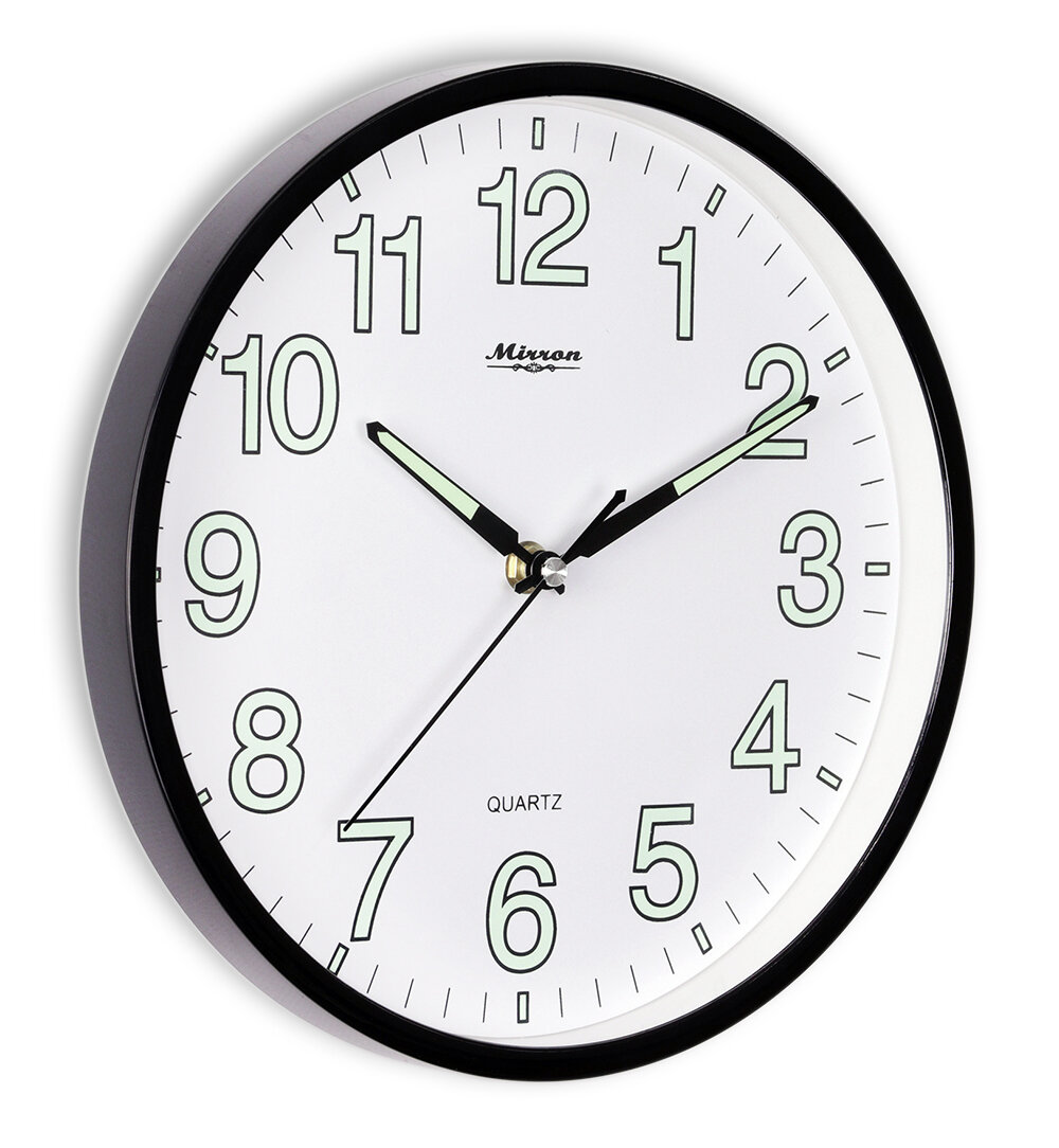 Купить Настенные кварцевые часы MIRRON P2864 ЧБ/Большие круглые часы/26 см/Белый (светлый) циферблат/Светящиеся цифры и стрелки/Чёрный цвет корпуса