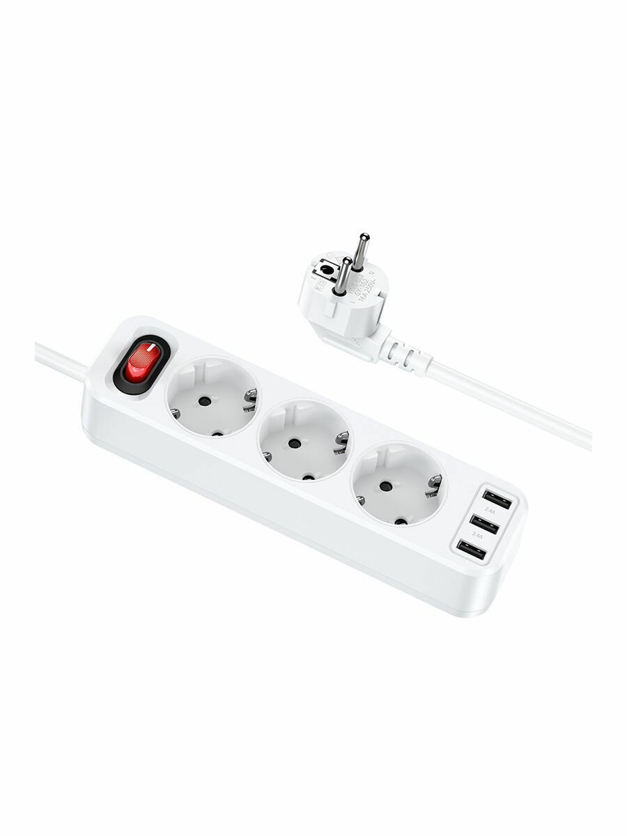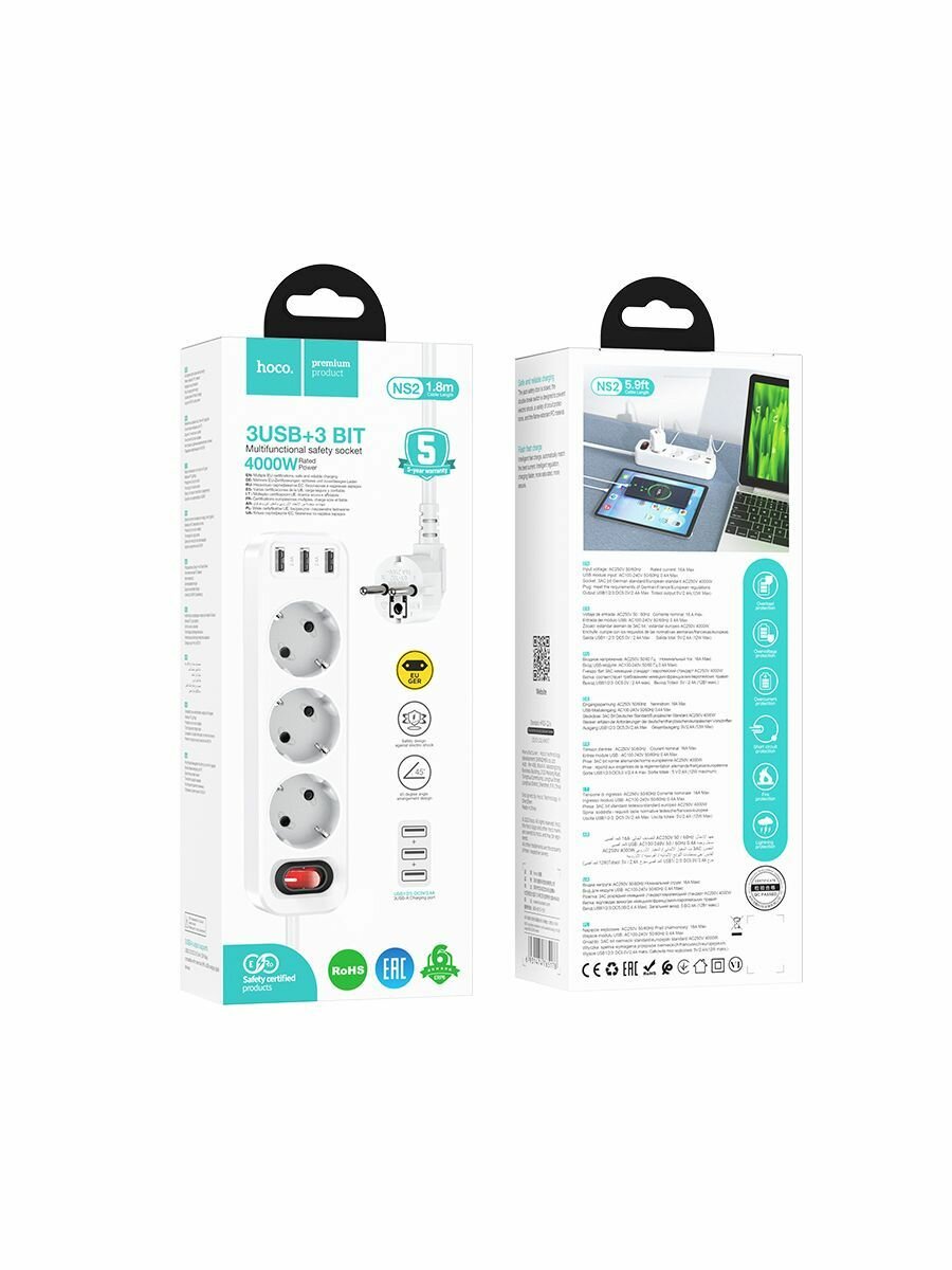 Купить Сетевой фильтр Hoco NS2 White 3 евро розетки 3.6кВт зарядка 3 порта USB-A 2.4А - 1.8м белый