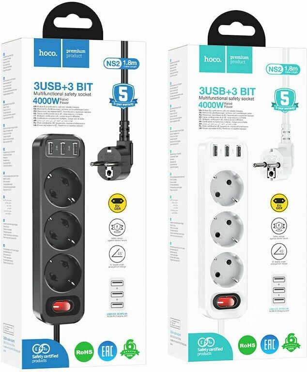 СохранитьСетевой фильтр Hoco NS2 White 3 евро розетки 3.6кВт зарядка 3 порта USB-A 2.4А - 1.8м белый интересное:
