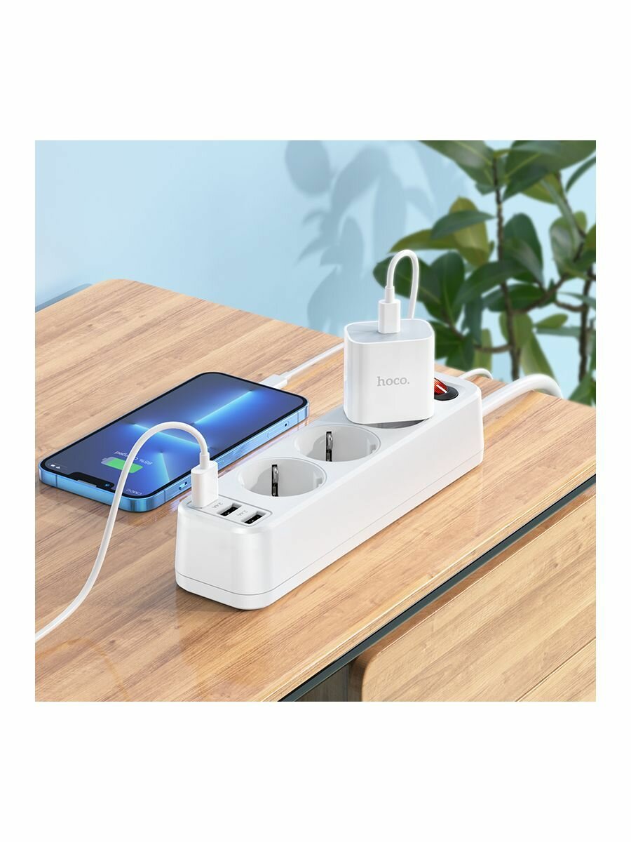Сетевой фильтр на 4 розетки+2 USB+1 PD, 1.8м, NS1, HOCO, белый