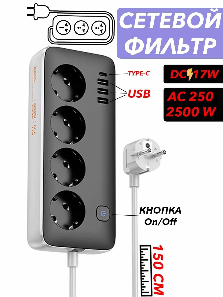 Мульти-функциональный сетевой фильтр с USB, зарядка 17W интересное: