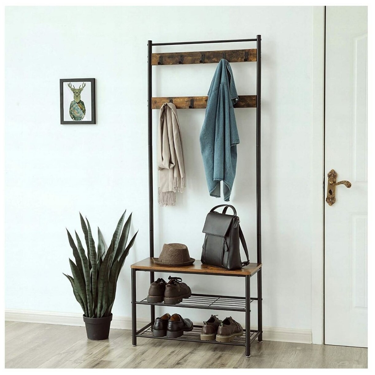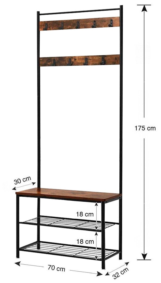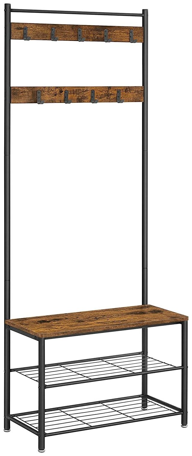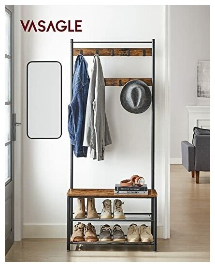 Вешалка напольная с полкой для обуви в стиле лофт премиум «VASAGLE» 9 крючков, 3 полки