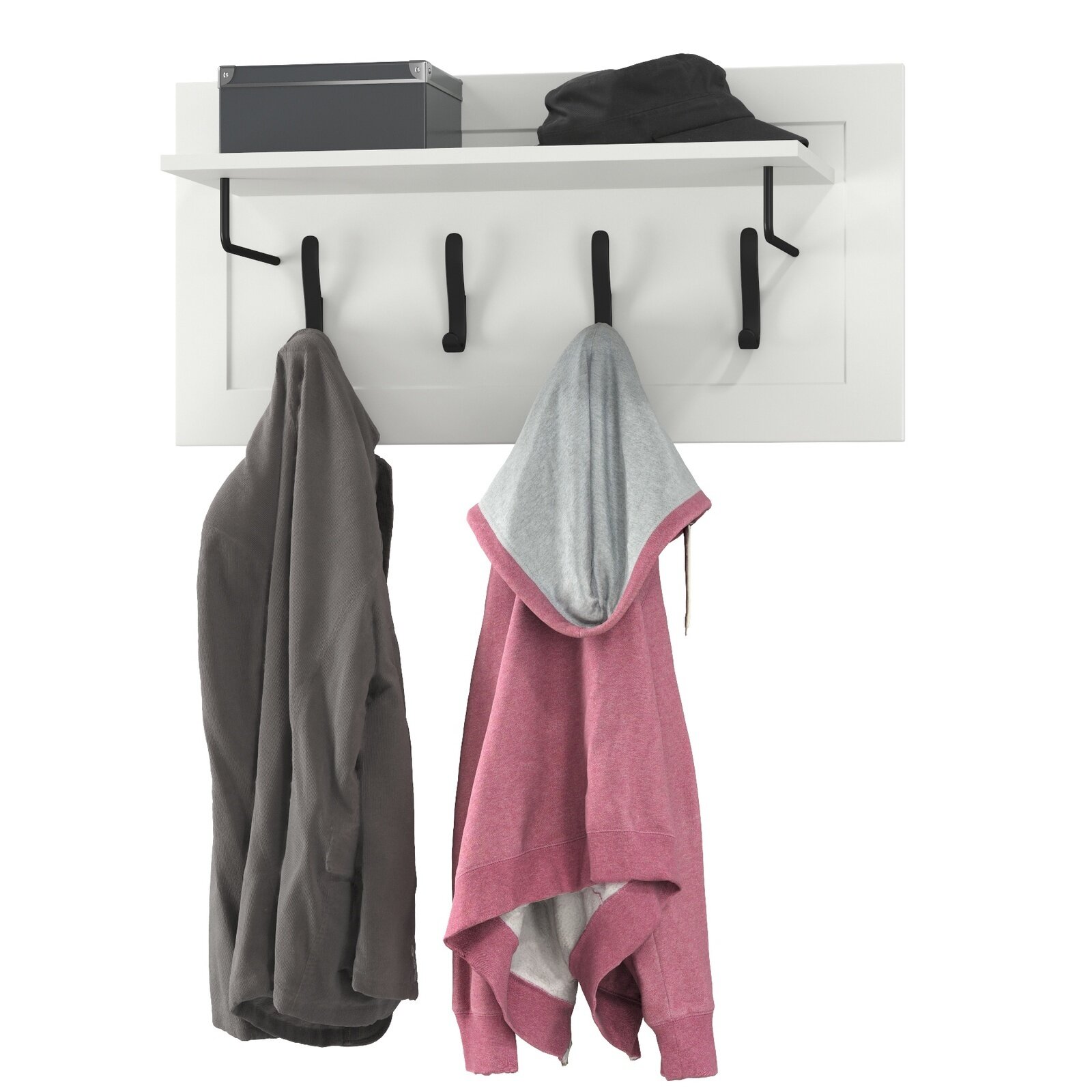 | Дополнительная информация | навесная вешалка с 4 двухрожковыми крючками и полкой для головных уборов; полка для головных уборов расположена над крючками и поддерживается двумя металлическими элементами; максимальная нагрузка на каждый крючек - 1,5 кг, на полку - 5 кг; поставляется в разобранном виде |