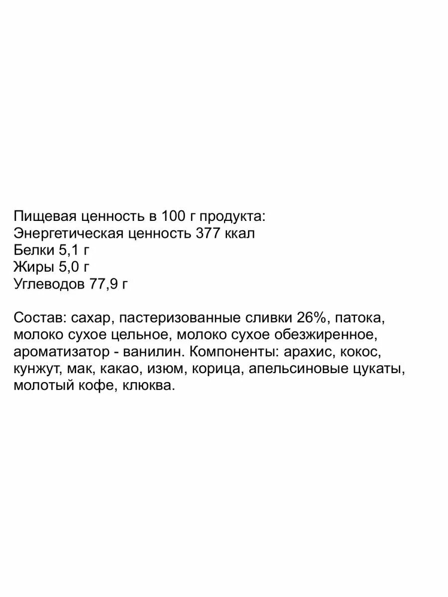 | Дополнительная информация | Конфеты Cream fudge бренда ВОЛГИР изготовлены из самых простых ингредиентов безо всяких подсластителей, ароматизаторов и консервантов по оригинальной польской рецептуре. Аппетитный корпус слегка неровной формы привлекает насыщенным вкусом настоящих сливок. А разнообразные наполнители только поддерживают это притяжение. Мак, кунжут, арахис, молотый кофе, какао, корица, клюква, цукаты апельсина, кокос и изюм - невероятный выбор для уютного чаепития! |