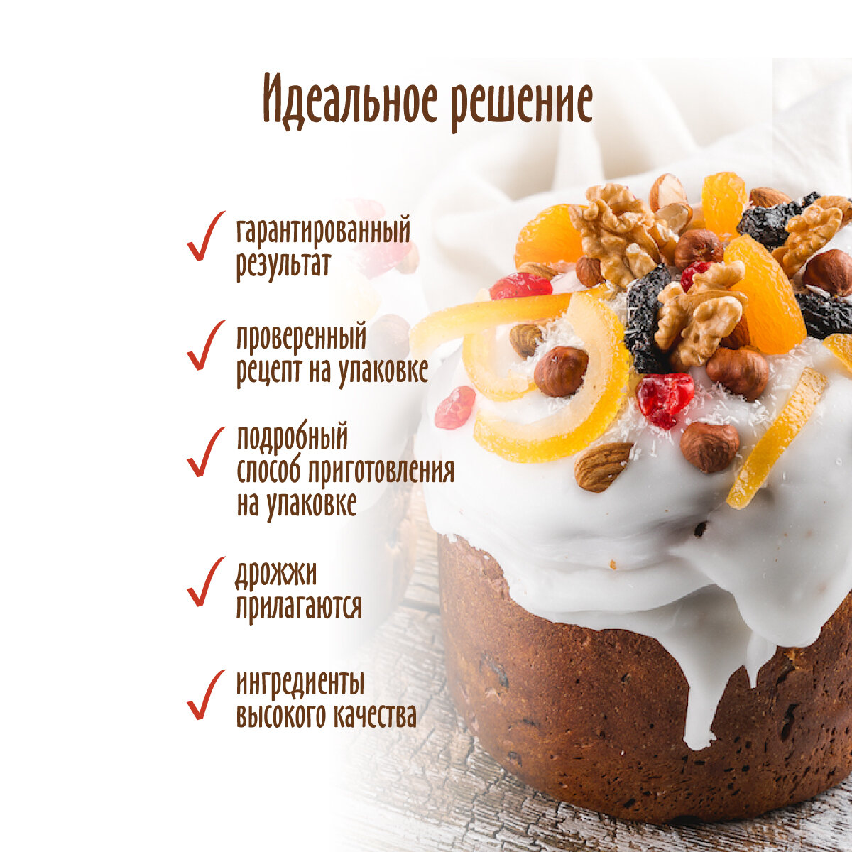 | Состав | Мука пшеничная хлебопекарная высшего сорта, сахар белый, яичный порошок, молоко сухое цельное, дрожжи хлебопекарные сухие (в отдельном пакетике), пищевая морская соль, пищевые добавки: ароматизатор ванилин. Может содержать следы сои, орехов, арахиса, кунжута, сельдерея, горчицы. |