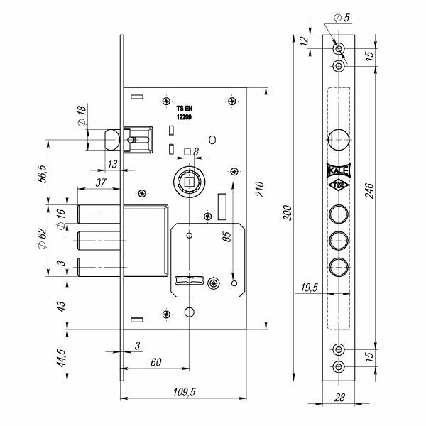 Замок врезной KALE 252-RL 5кл.-сувальдный