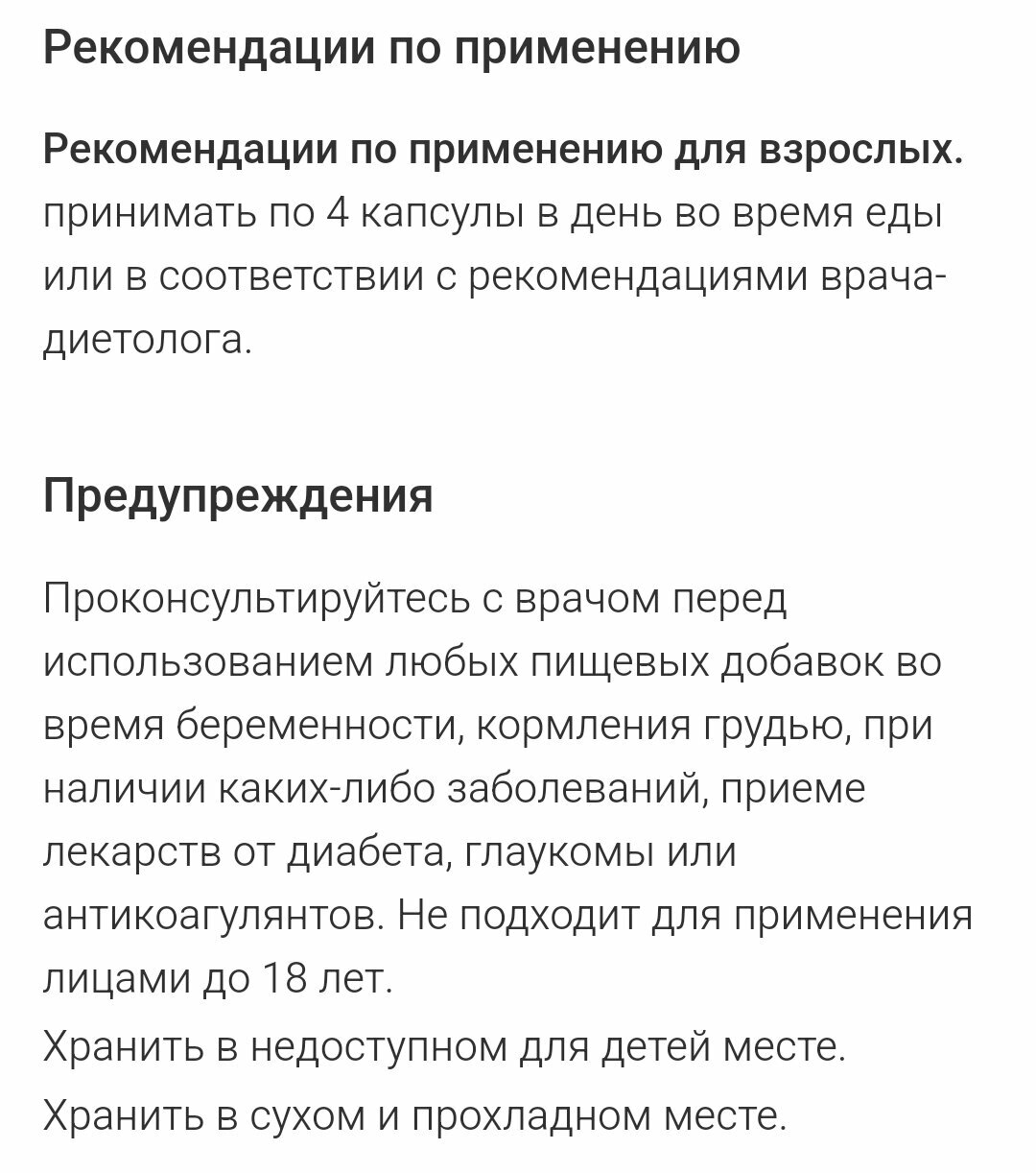 | Дополнительная информация | Перед началом применения во время беременности, кормления грудью, при наличии каких-либо заболеваний, в случае приема варфарина или медикаментов от диабета или глаукомы следует проконсультироваться с врачом. Не подходит для применения лицами до 18 лет. Хранить в недоступном для детей месте. Хранить в сухом и прохладном месте; рекомендации по применению: Принимать по 4 капсулы в день во время еды или в соответствии с рекомендациями врача-диетолога.; состав: Хлорид (из глюкозамина сульфата 2KCl) - 180 мг, Натрий (из хондроитин сульфата натрия) - 85 мг, Калий (из глюкозамина сульфата 2KCl) - 180 мг, Сульфат глюкозамина 2KCl - 1500 мг, Хондроитин сульфат (из натрия хондроитин сульфата) - 1200 мг, МСМ (метилсульфонилметан) (OptiMSM) - 1000 мг |
