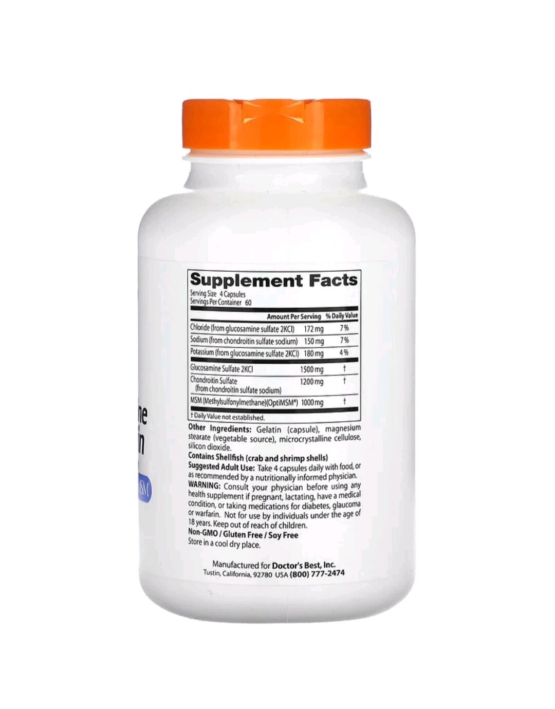 | Дополнительная информация | Перед началом применения во время беременности, кормления грудью, при наличии каких-либо заболеваний, в случае приема варфарина или медикаментов от диабета или глаукомы следует проконсультироваться с врачом. Не подходит для применения лицами до 18 лет. Хранить в недоступном для детей месте. Хранить в сухом и прохладном месте; рекомендации по применению: Принимать по 4 капсулы в день во время еды или в соответствии с рекомендациями врача-диетолога.; состав: Хлорид (из глюкозамина сульфата 2KCl) - 180 мг, Натрий (из хондроитин сульфата натрия) - 85 мг, Калий (из глюкозамина сульфата 2KCl) - 180 мг, Сульфат глюкозамина 2KCl - 1500 мг, Хондроитин сульфат (из натрия хондроитин сульфата) - 1200 мг, МСМ (метилсульфонилметан) (OptiMSM) - 1000 мг |