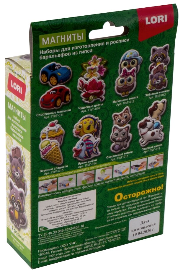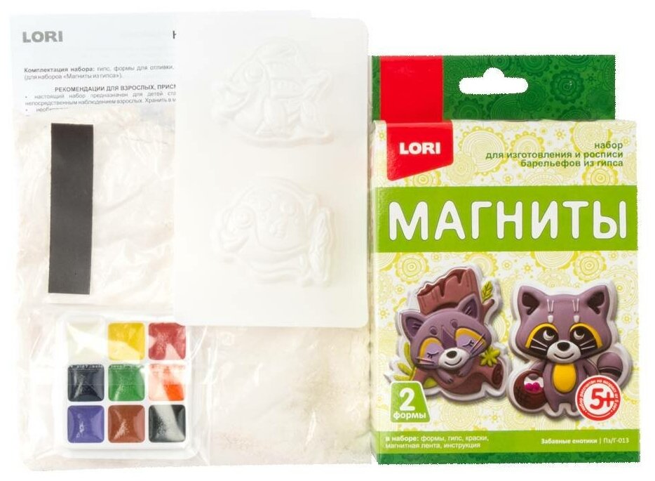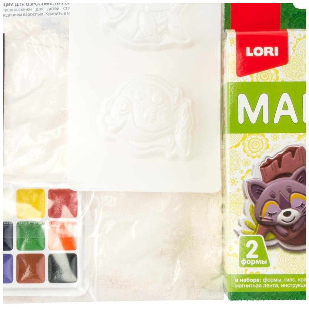 | Комплектация | пластиковые формы 2 шт., гипс, акварельные краски, магнитная лента, инструкция |