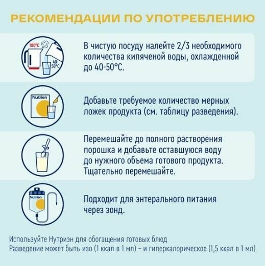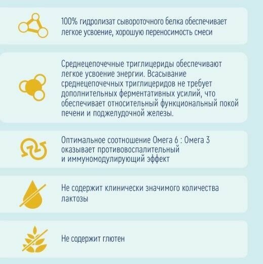 | Назначение | аллергия на коровье молоко / для питания в пред- и послеоперационном периоде / заболевания ЖКТ / мальабсорбция / муковисцидоз / синдром укороченной тонкой кишки / хронические воспалительные заболевания кишечника |