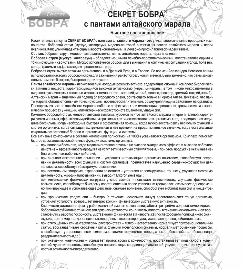 | Состав | Бобровая струя, медово-пантовая вытяжка, панты алтайского марала, перга пчелиная. |