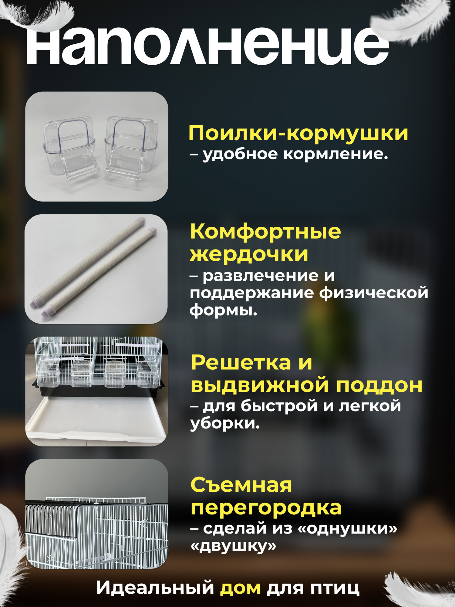 Клетка для птиц, 48х37х41 см., разделение на секции, выдвижной поддон, фальшдно, поилки-кормушки, жердочки, белый