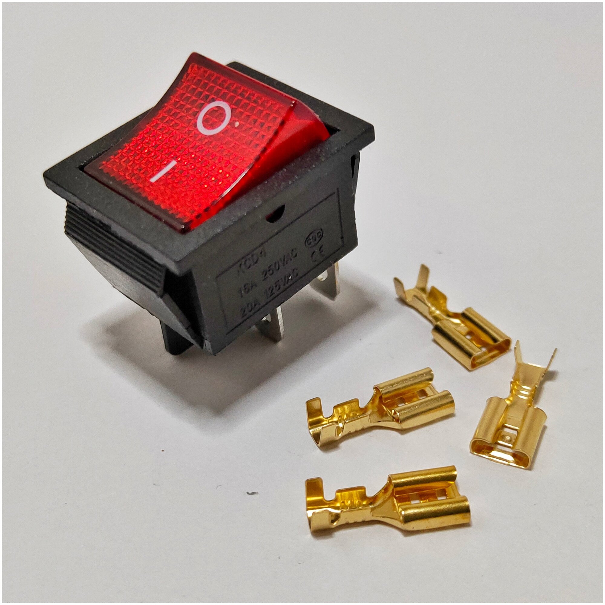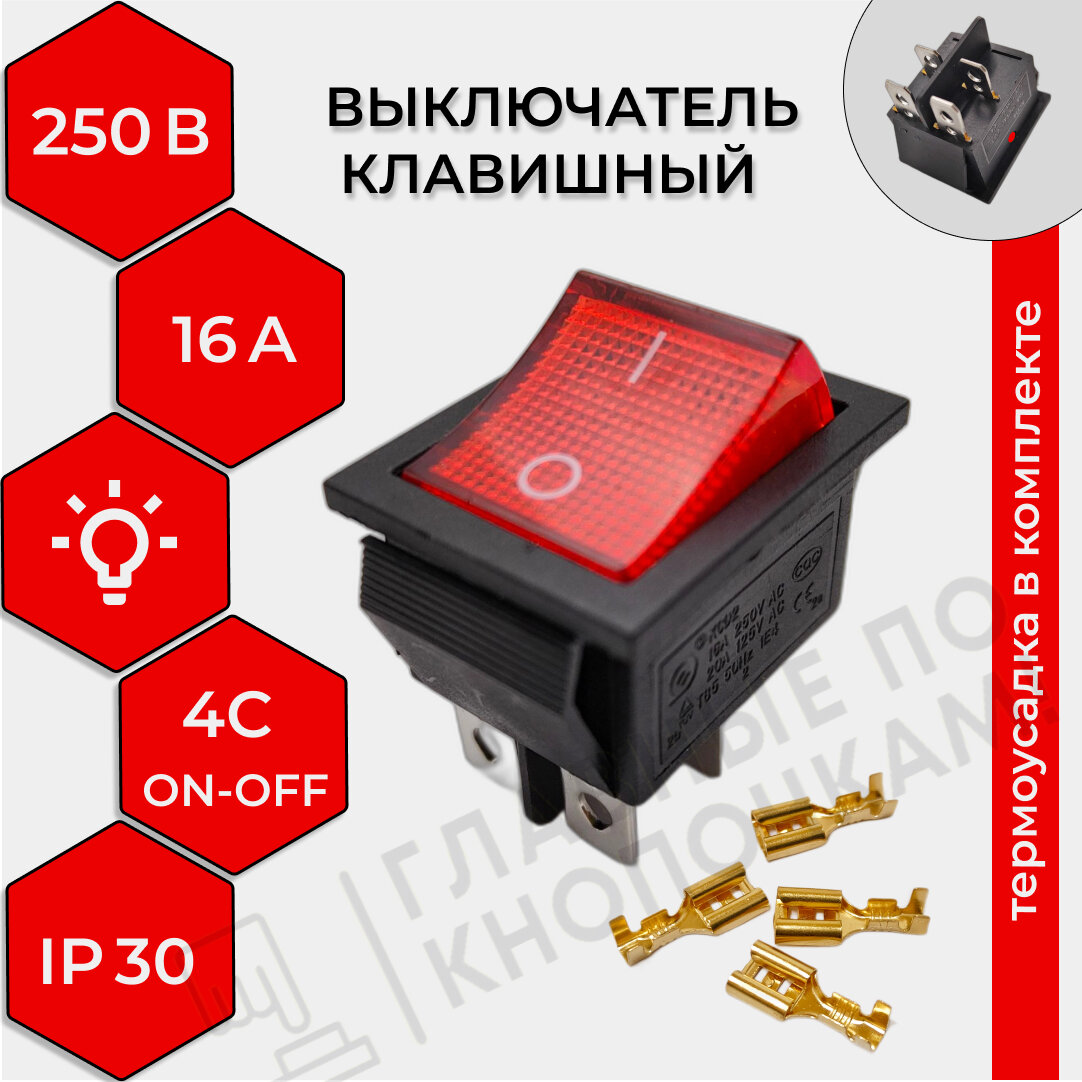 Выключатель клавишный 250В, подсветка, 16А, (4с), ON-OFF, красный (комплект с клеммами и термоусадкой)