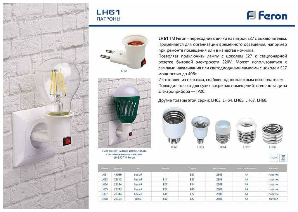 Ниже Вы можете прочитать отзывы на FERON Патрон-переходник с E27 на розетку , с выключ, 230V, пластик, белый, 40х60мм, LH61 41039, ознакомится с подробными характеристиками, посмотреть интересные обзоры и фотографии на FERON Патрон-переходник с E27 на розетку , с выключ, 230V, пластик, белый, 40х60мм, LH61 41039.
