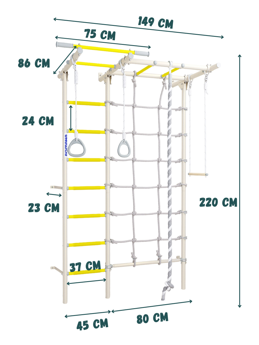 | Подробная комплектация | шведская стенка,турник,рукоход,сетка для лазания,канат,кольца,трапеция,гамак |