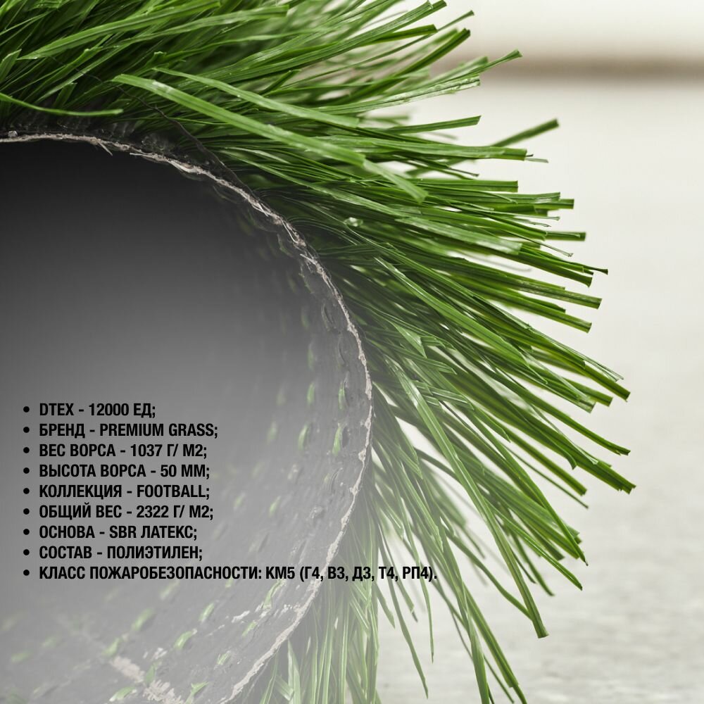 Рулон искусственного газона PREMIUM GRASS "Football 50 Green 12000" 2х3 м. Спортивная, декоративная трава с высотой ворса 50 мм.