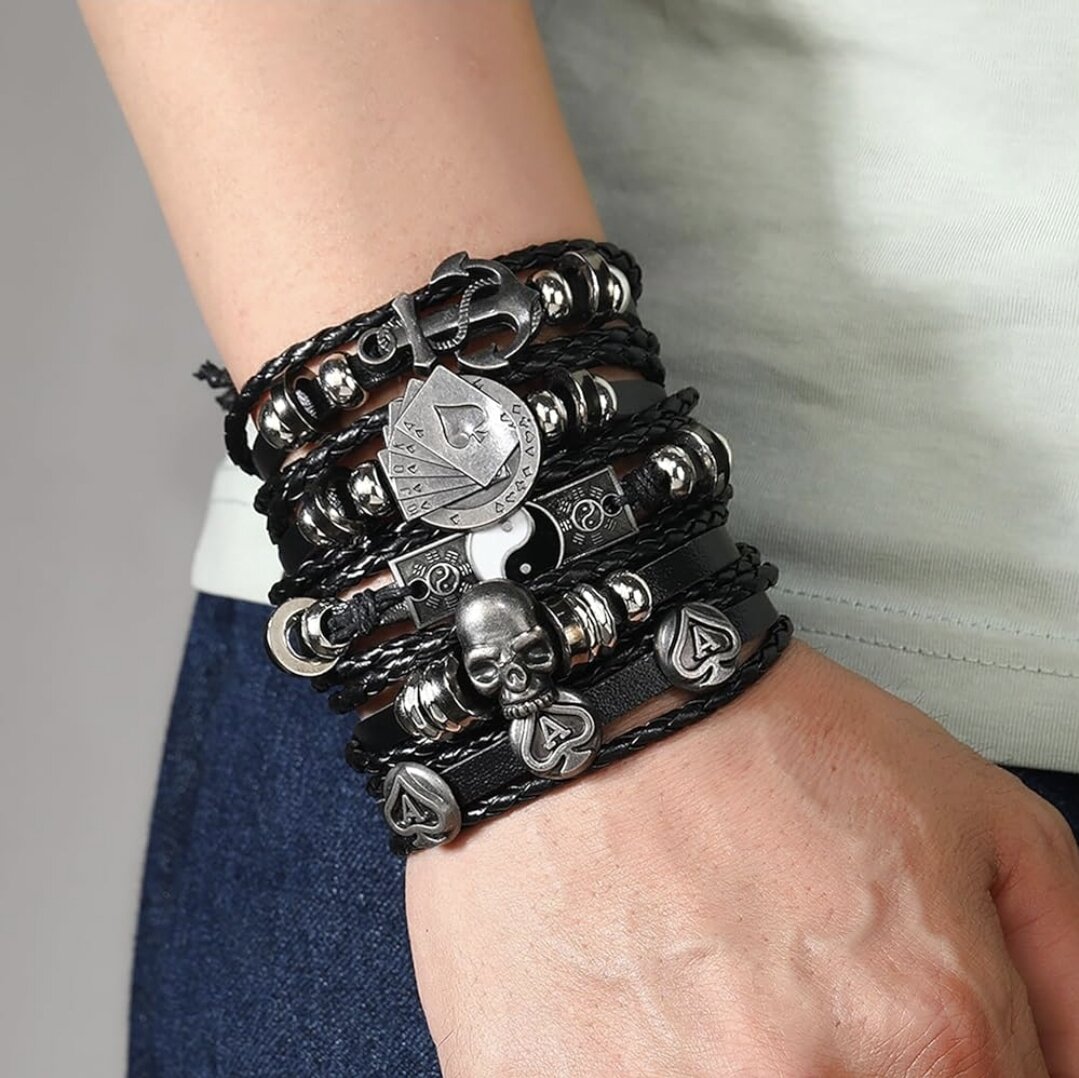 | Дополнительная информация | Браслет на завязках безразмерный, кожаный, бижутерия, украшение на руку, комплект\набор 5 в 1 |