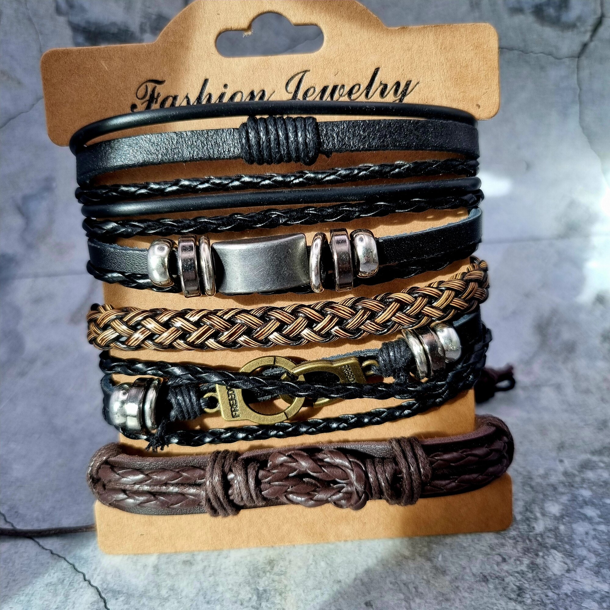 | Дополнительная информация | Браслет на завязках безразмерный, кожаный, бижутерия, украшение на руку, комплект\набор 5 в 1 |