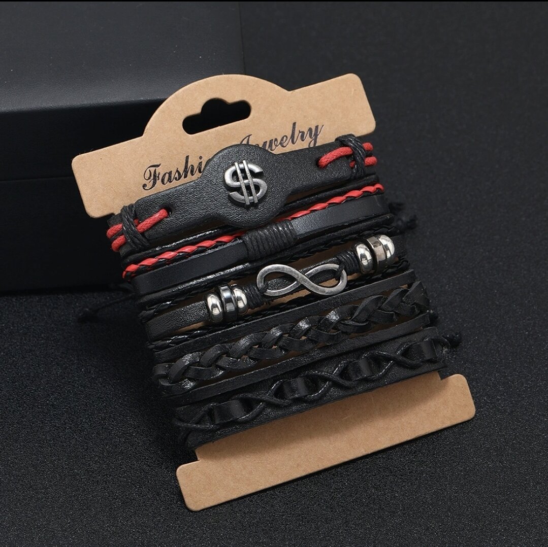 Браслет на руку на завязках 5 в 1 плетеный, знак доллара, бесконечность, косички, унисекс, мужской/женский/для подростков, сплав+экокожа, 5 в 1, черный/красный