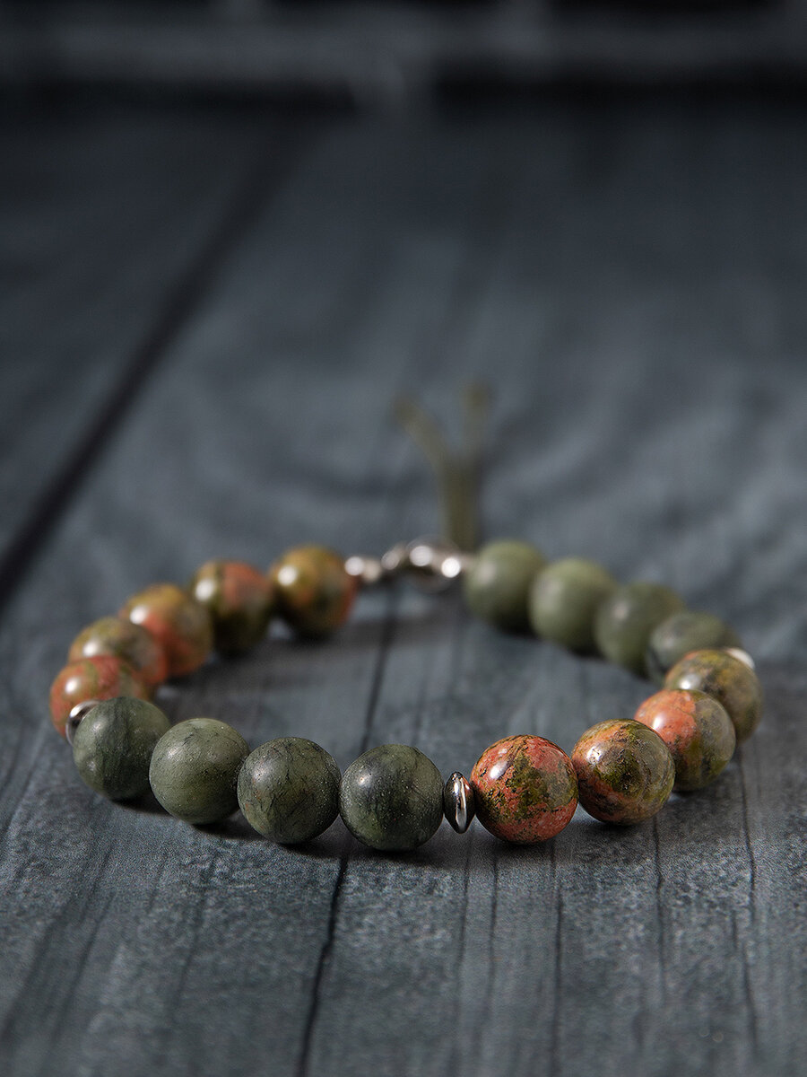 Одолень - трава - Браслет мужской / женский из натуральных камней (нефрит и унакит), размер 15-17,5