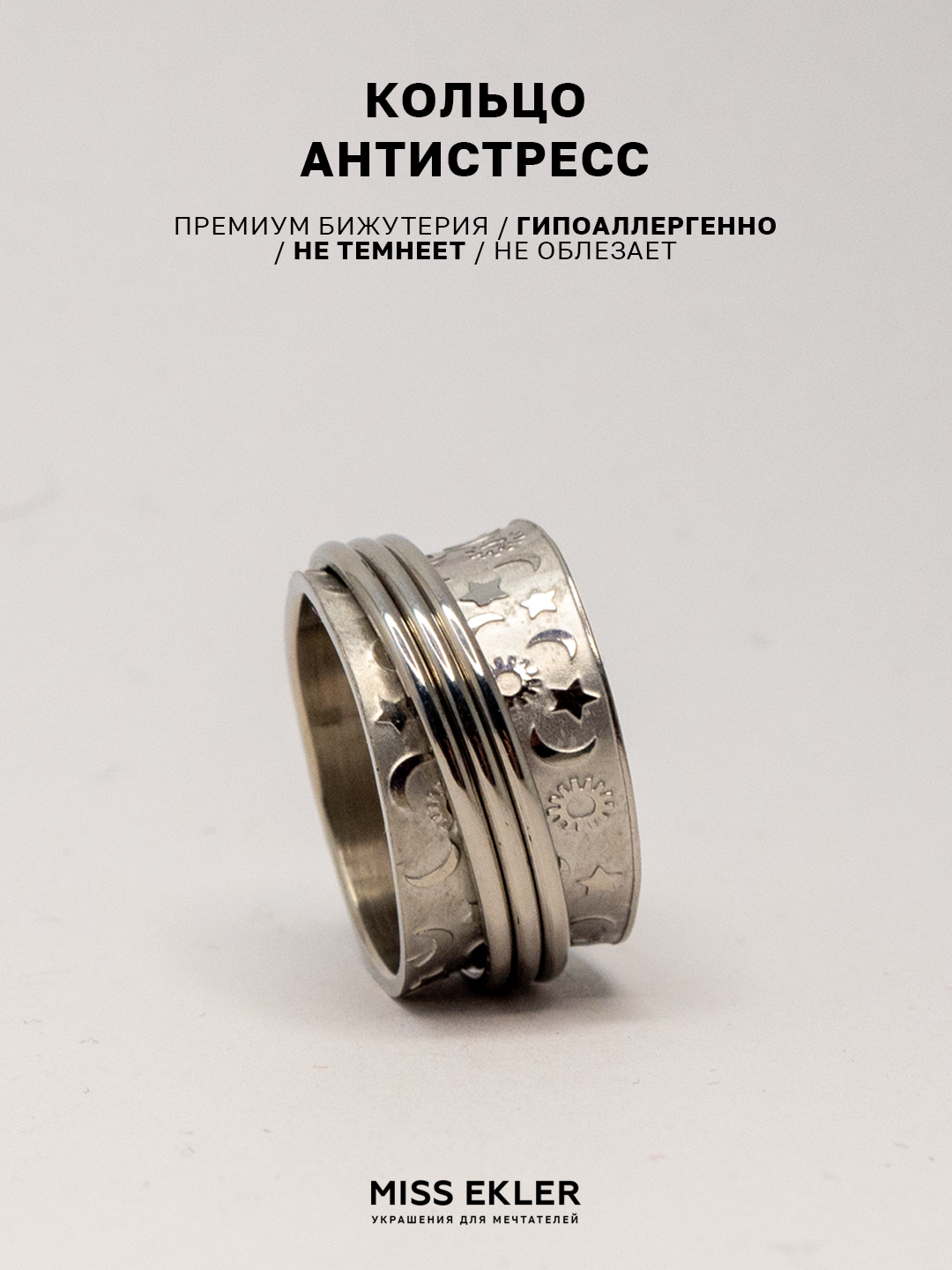 Кольцо-механизм "Антистресс" Miss Ekler, ювелирная сталь, с луной и звёздами, 21 размер
