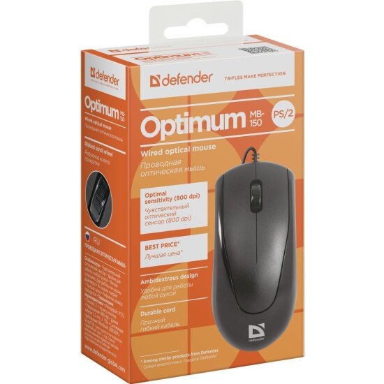 Мышь проводная Defender Optimum MB-150 / оптическая / 2 + колесо кнопка / 800 dpi / PS/2 / каб - 1,4м / чёрный. 52150