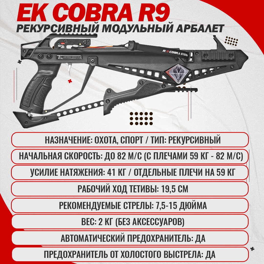 | Дополнительная информация | Модульная система R9 позволит вам разобрать арбалет в течение нескольких секунд. Вы можете легко снять плечи в сборе с тетивой. Дополнительный приклад Ar-Style можно разместить на пистолете в течение нескольких секунд. |