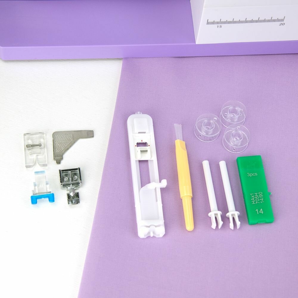 | Комплектация | Универсальная лапка b. Лапка для вшивания молнии c. Лапка для выполнения петли d. Лапка для пришивания пуговиц e. Вспарыватель-щеточка f. Упаковка игл g. Шпульки (3 шт) h. Отвертка i. Дополнительный стержень для катушки j. Мягкий чехол Педаль. Инструкция на русском |