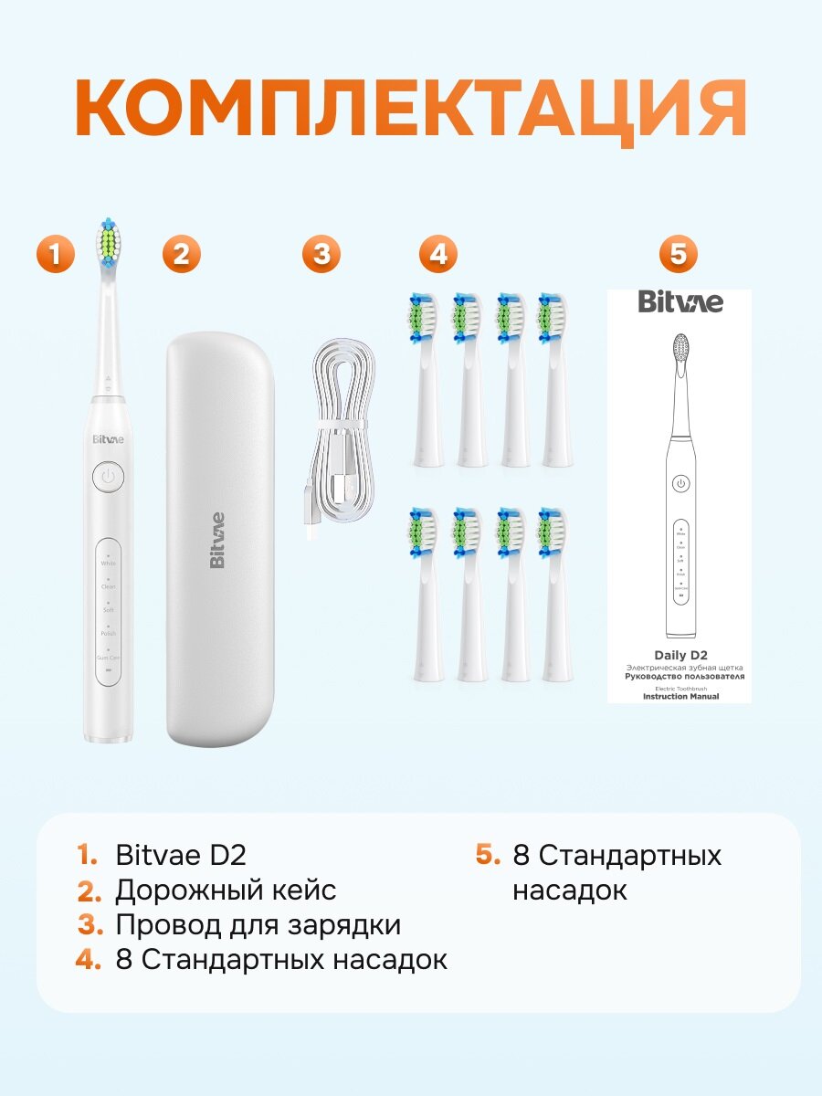 | Подробная комплектация | зубная щетка Bitvae D2, насадки для щетки, 8 шт. (с щетинками средней жесткости), защитный колпачок для насадки, 1 шт., дорожный футляр, подставка, кабель для зарядки, руководство пользователя |