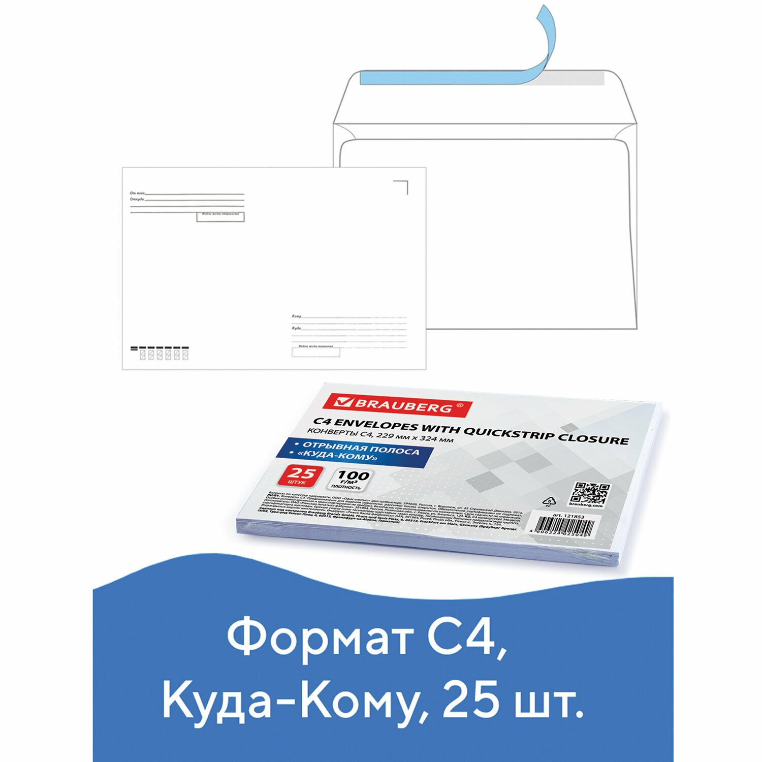 Конверты С4 Brauberg (229х324 мм), отрывная полоса, "Куда-Кому", 100 г/м2, комплект 25 шт., , 121853