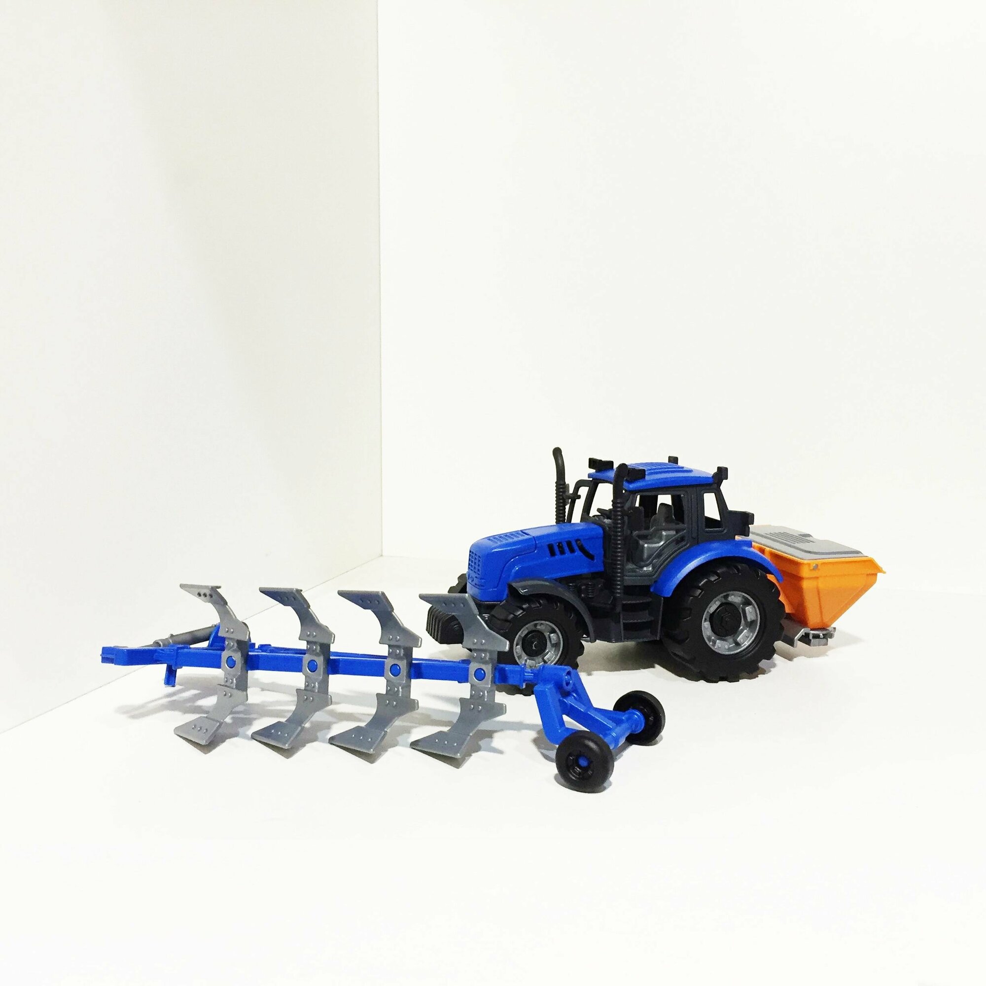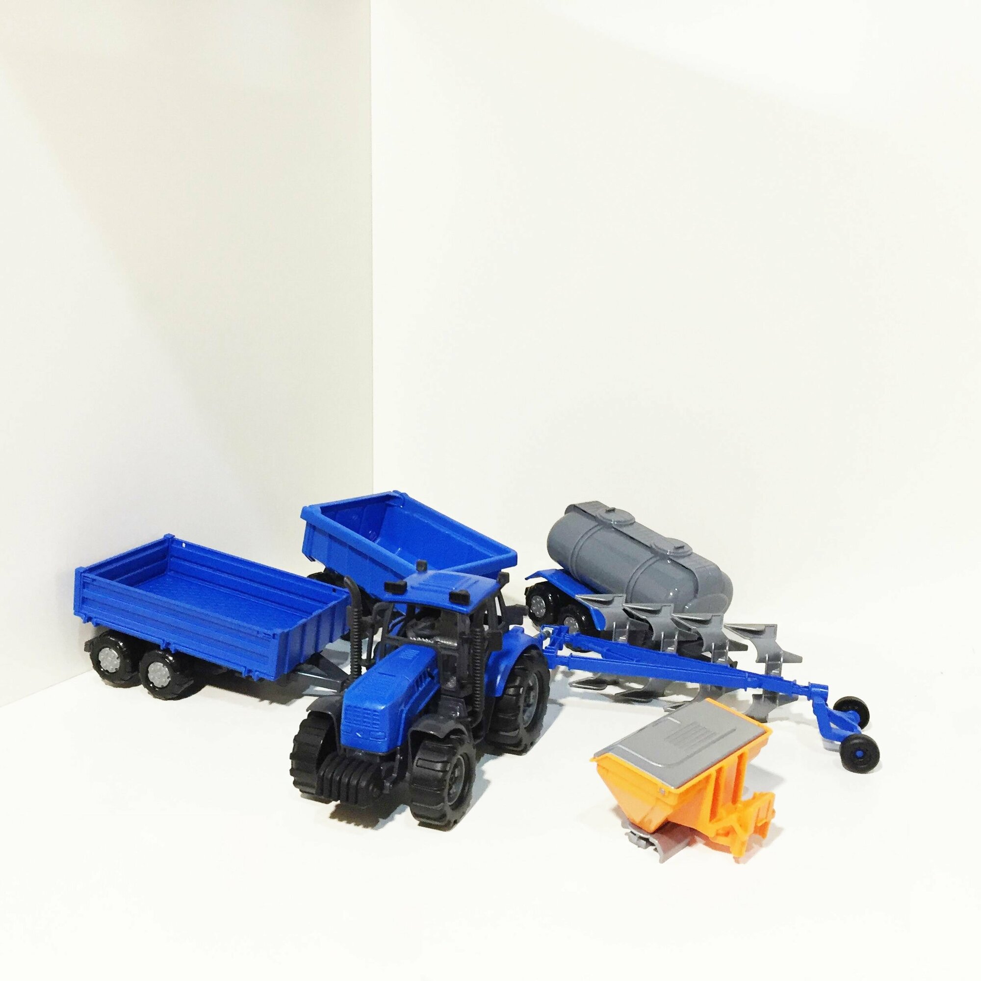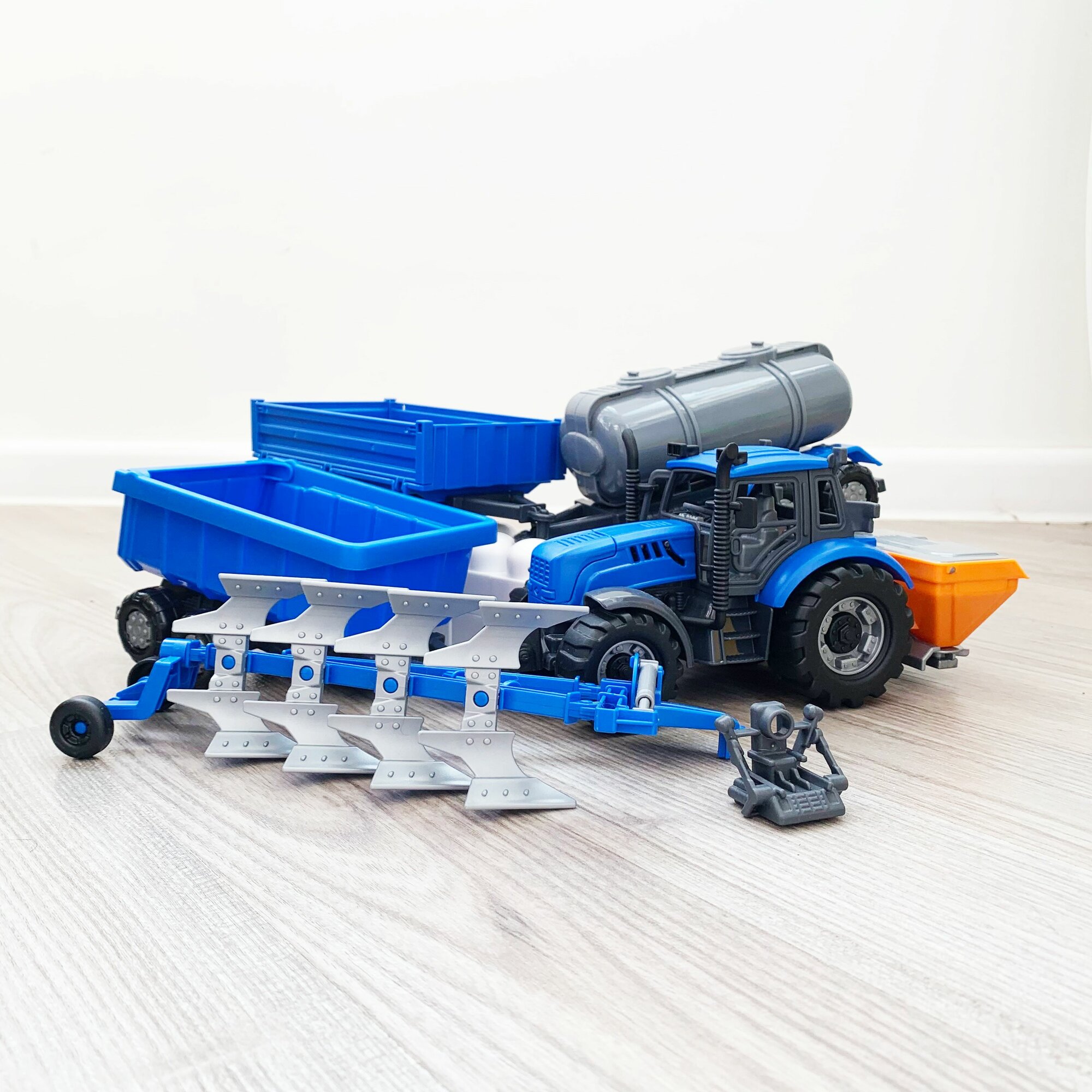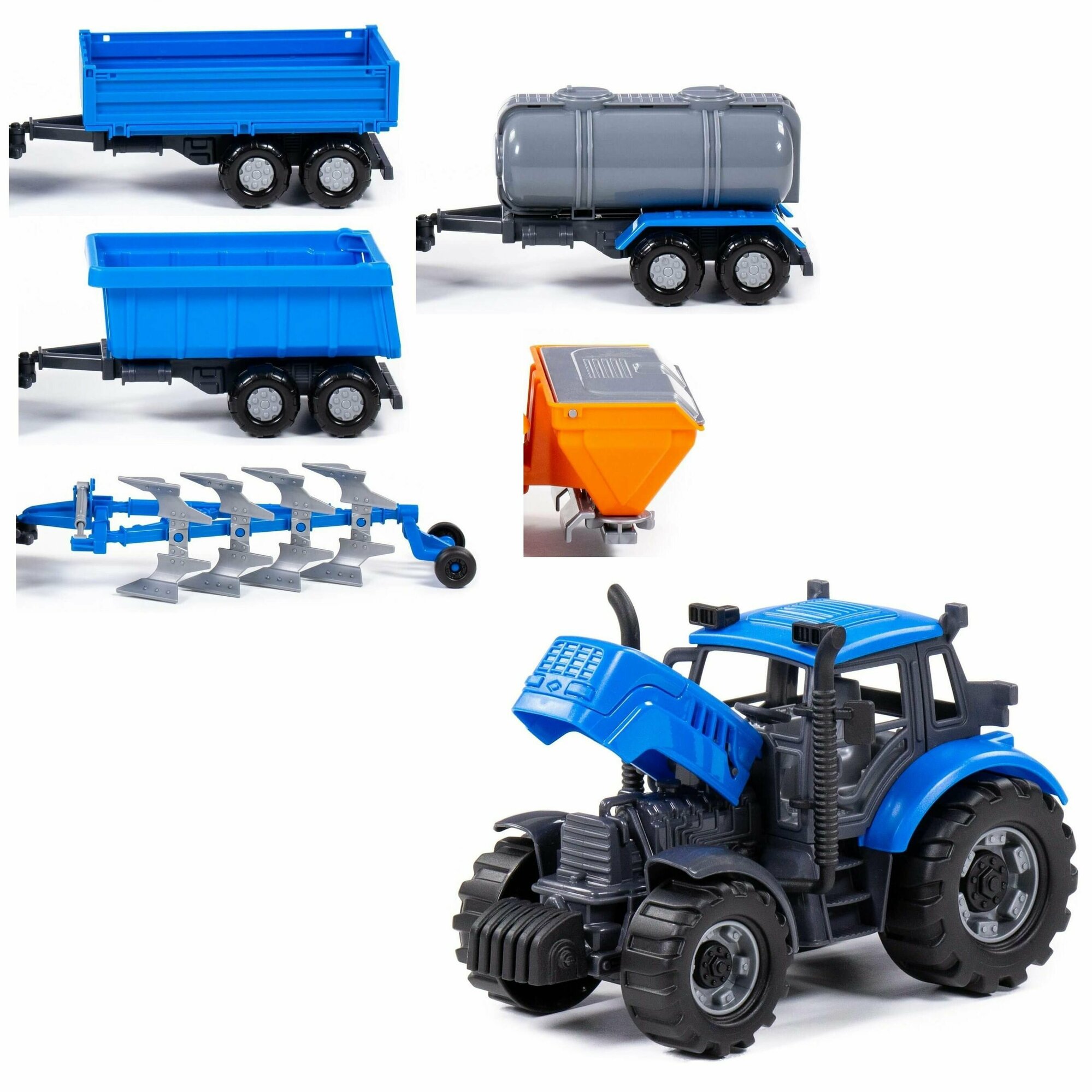 Купить Инерционный трактор 18,8 см + 5 прицепов (кузовной, бортовой, цистерна, плуг, сеялка) / Прогресс Полесье (синий)