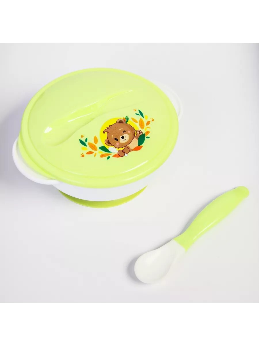 Набор детской посуды "Друзья", 3 предмета: тарелка на присоске, крышка, ложка, цвет зелёный