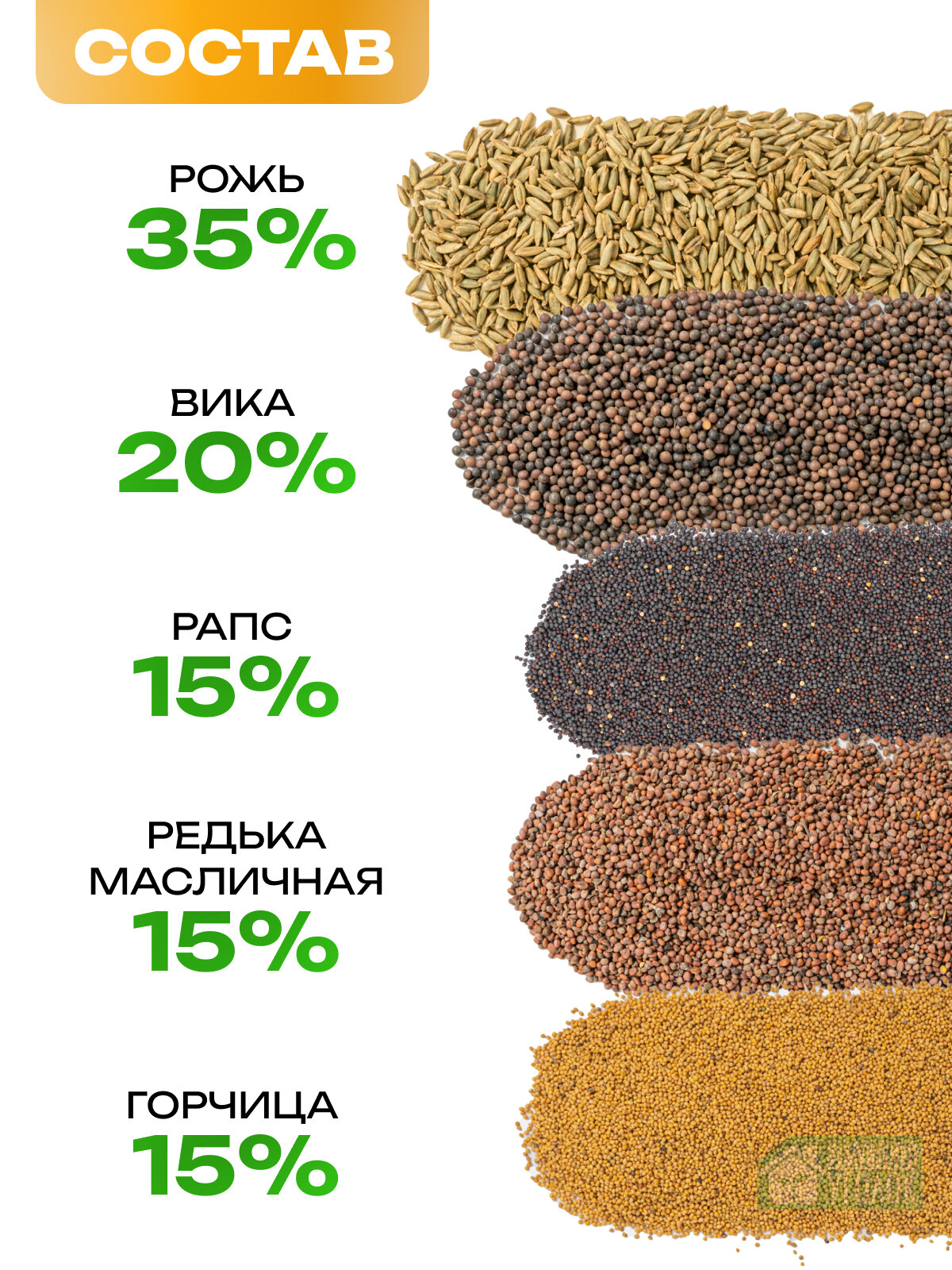 | Состав смеси | рожь 35%, вика 20%, горчица 15%, редька масличная 15%, рапс 15% |