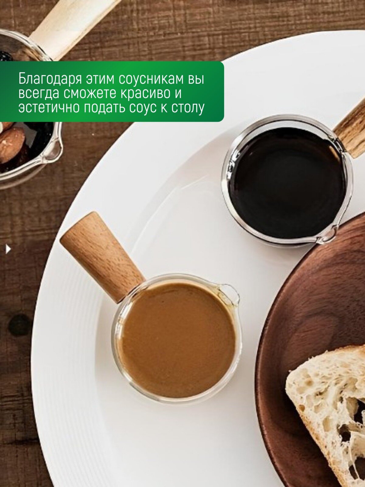 Стеклянный соусник с деревянной ручкой 100 мл набор 2 штуки