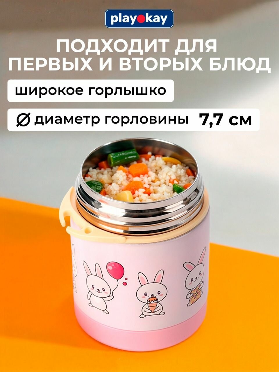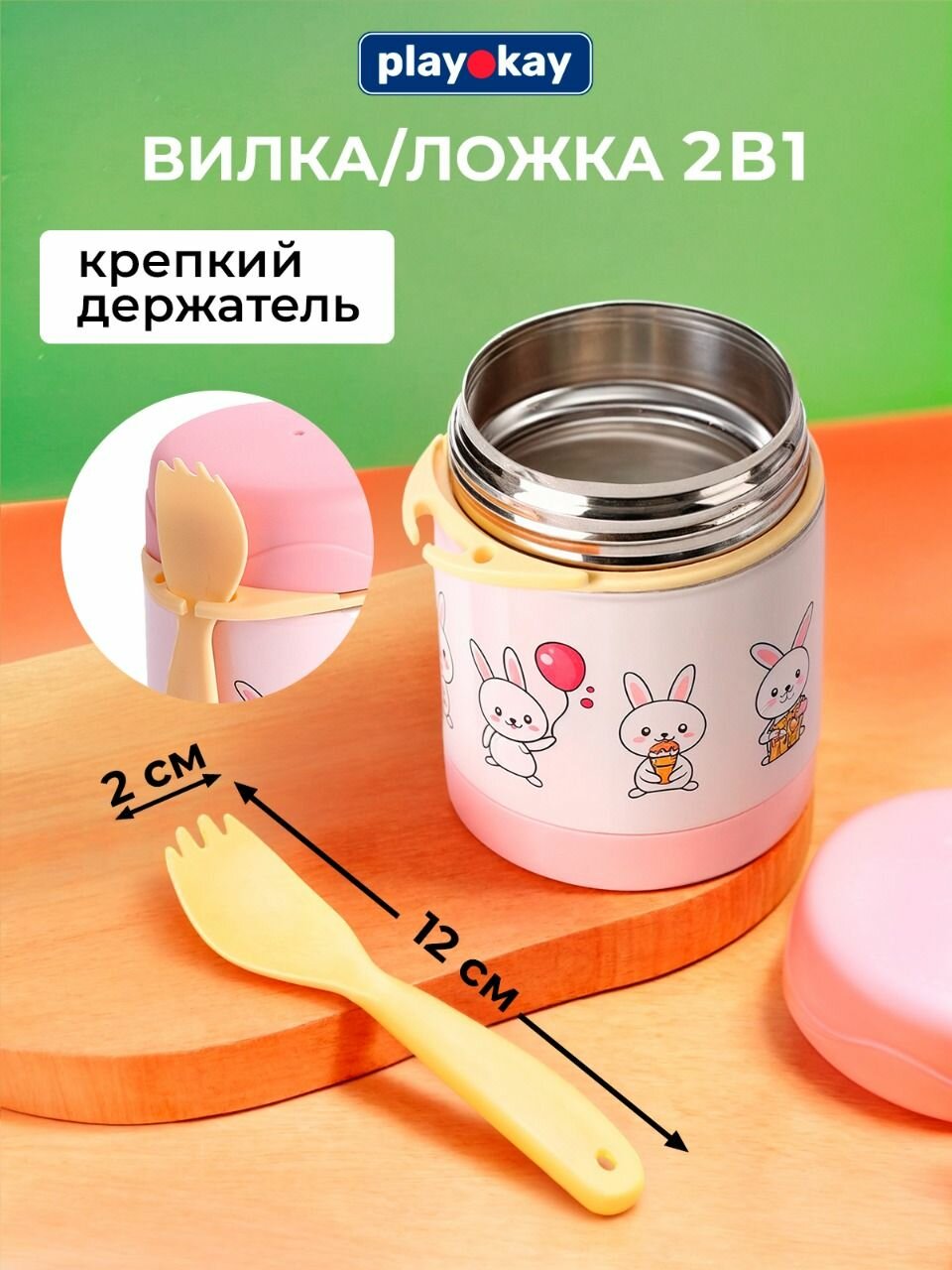 Термос вакуумный для еды с широким горлом и вилкой Play Okay, ланч-бокс, контейнер детский в школу, кружка для супа из нержавеющей стали, розовый 300 мл