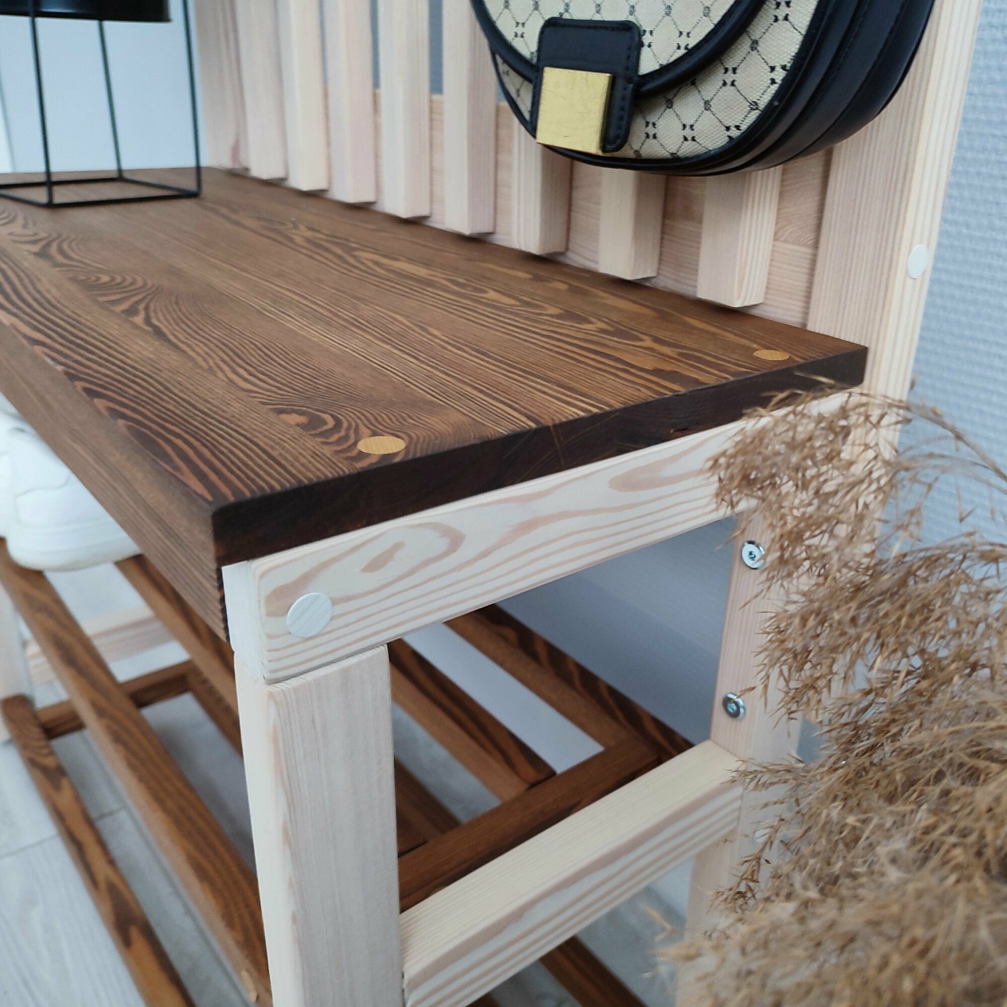 Комплект в прихожую, деревянная вешалка с обувницей, прихожая из массива Лиственницы 185х74х30, цвет орех, в скандинавском стиле, минимализм