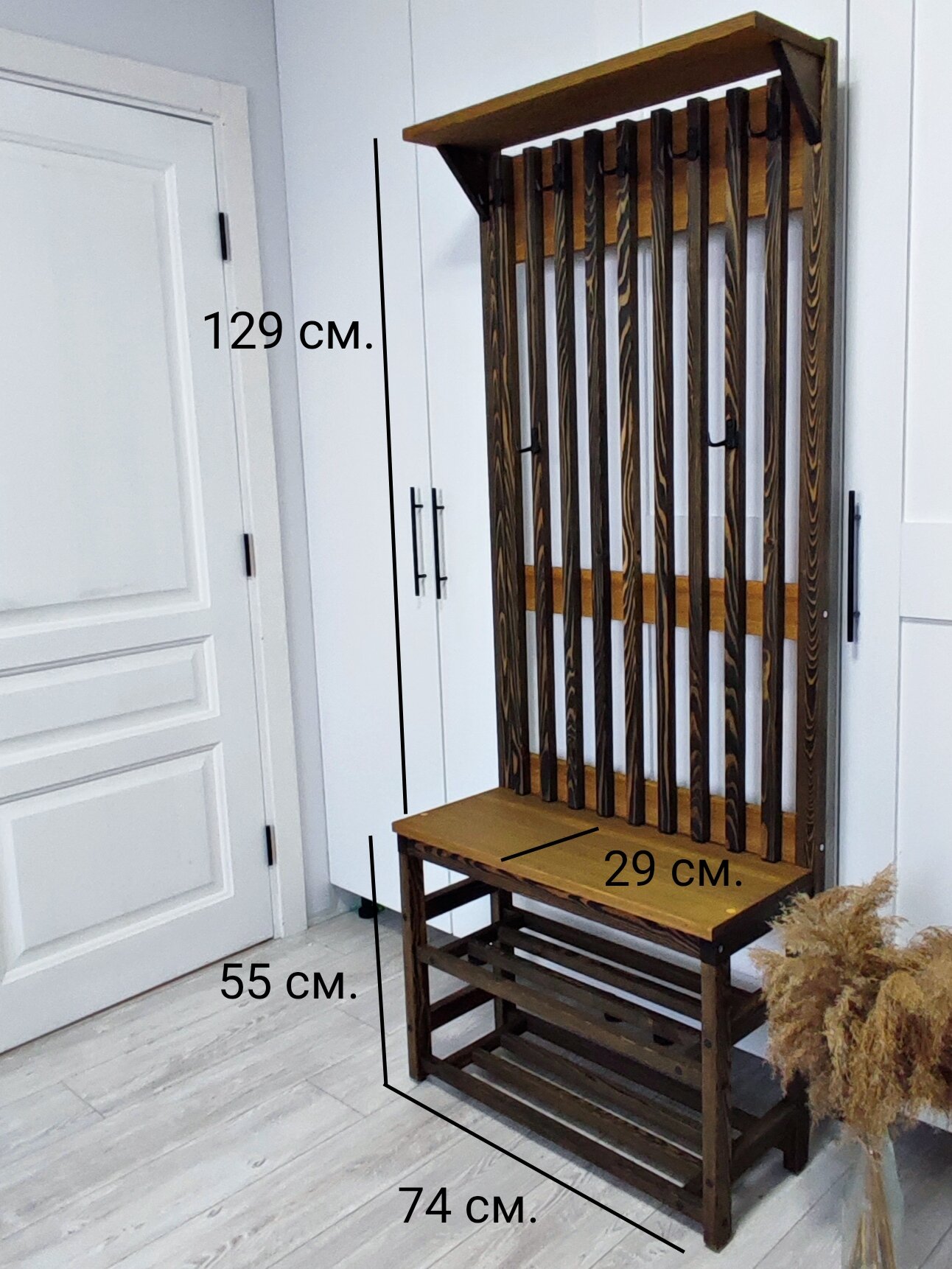 Комплект в прихожую, деревянная вешалка с обувницей, прихожая из массива Лиственницы 185х74х30, цвет орех, минимализм