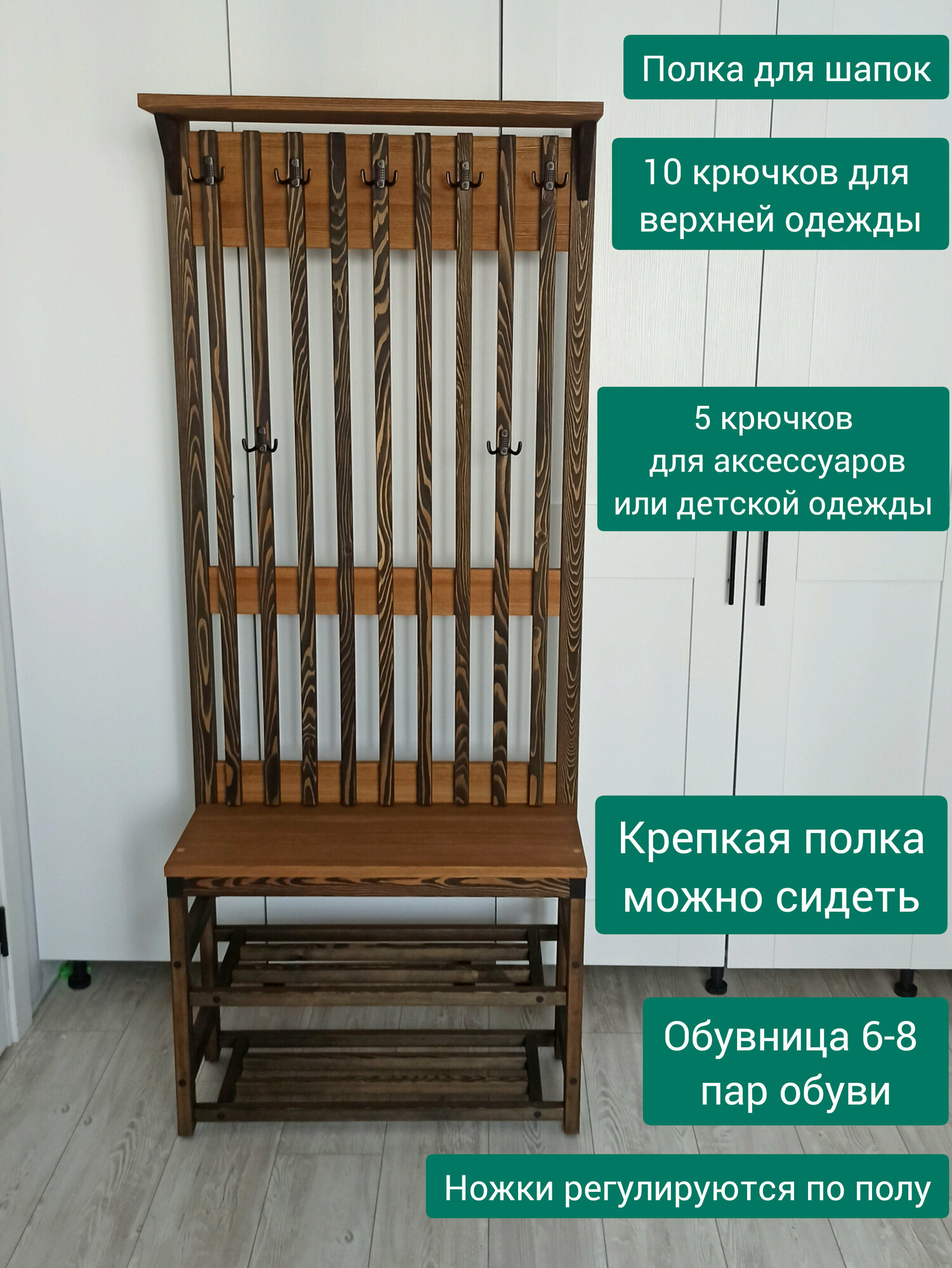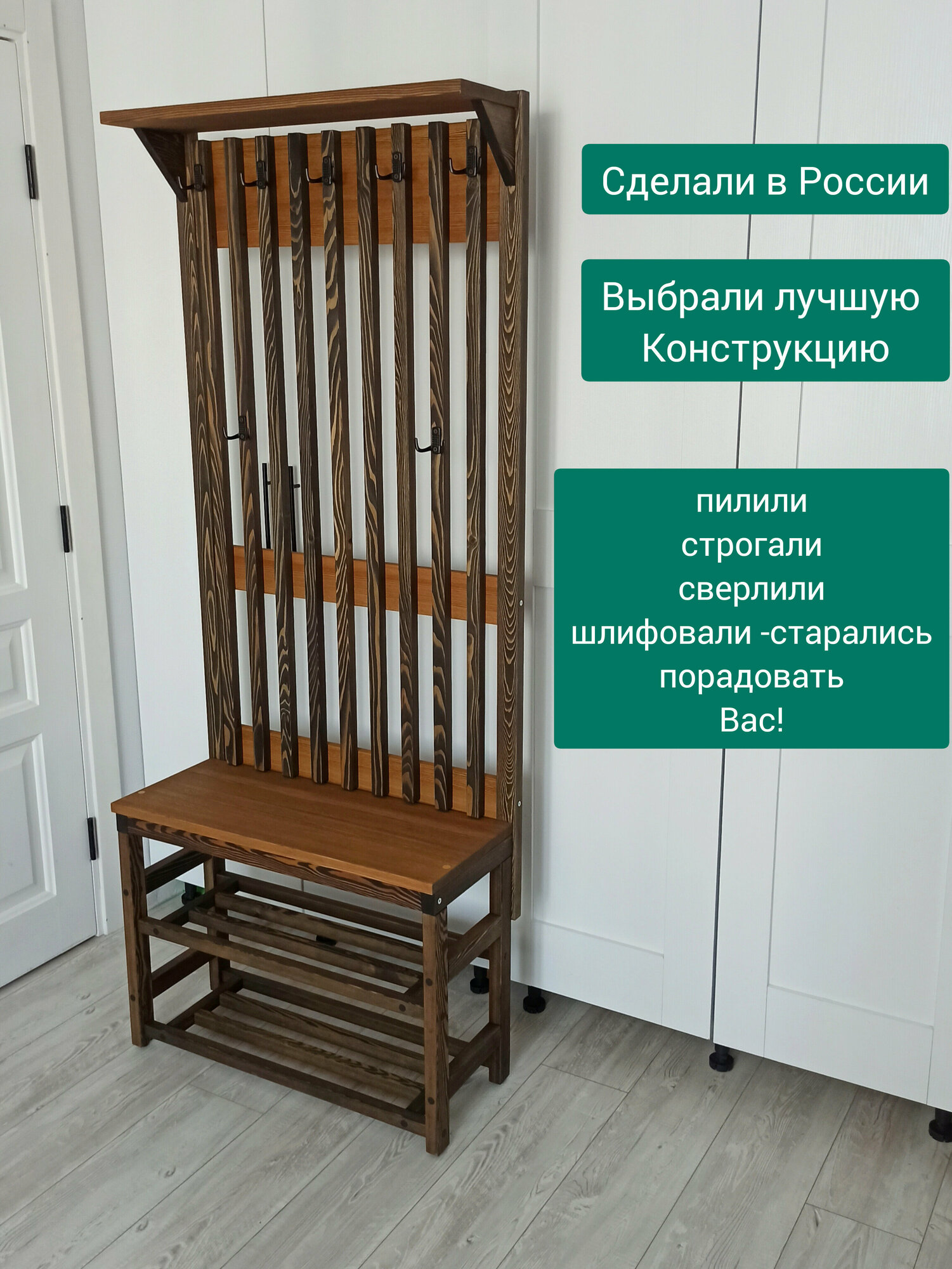 Комплект в прихожую, деревянная вешалка с обувницей, из массива Лиственницы 185х74х30, цвет можжевельник, минимализм