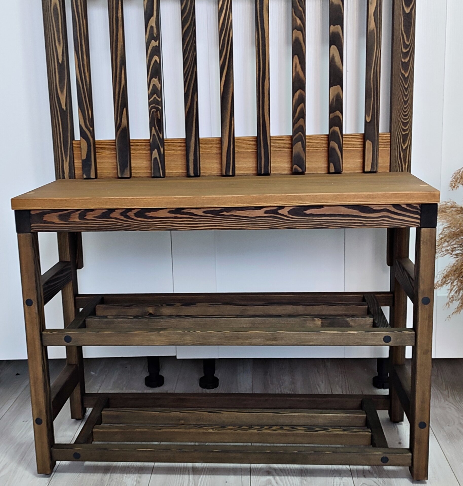 Купить Прихожая деревянная с обувницей из массива Лиственницы, черный + орех, минимализм 185х76х30