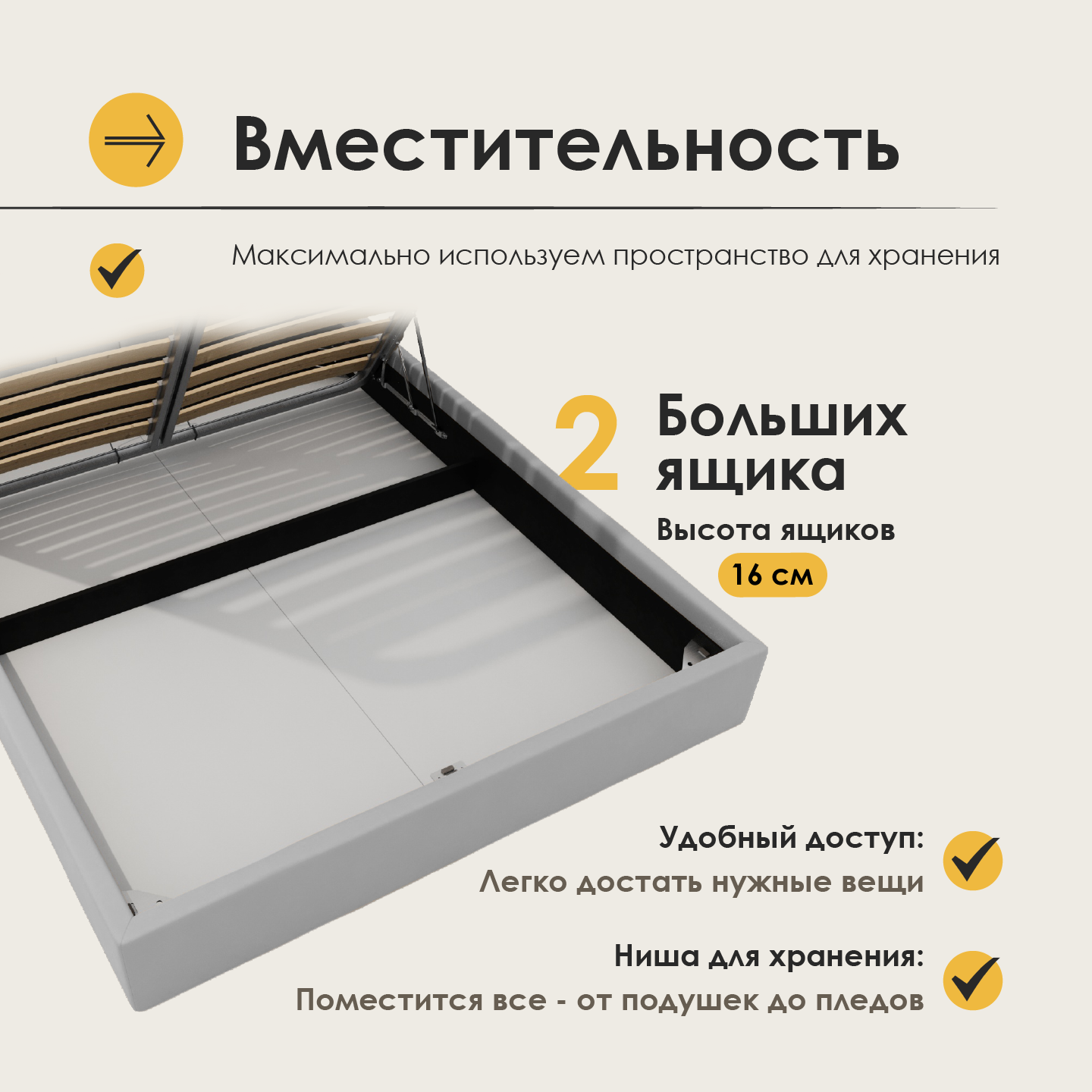 Кровать 160х200 двуспальная Маргарида, с подъёмным механизмом, с ящиками, с мягким изголовьем, бежевый