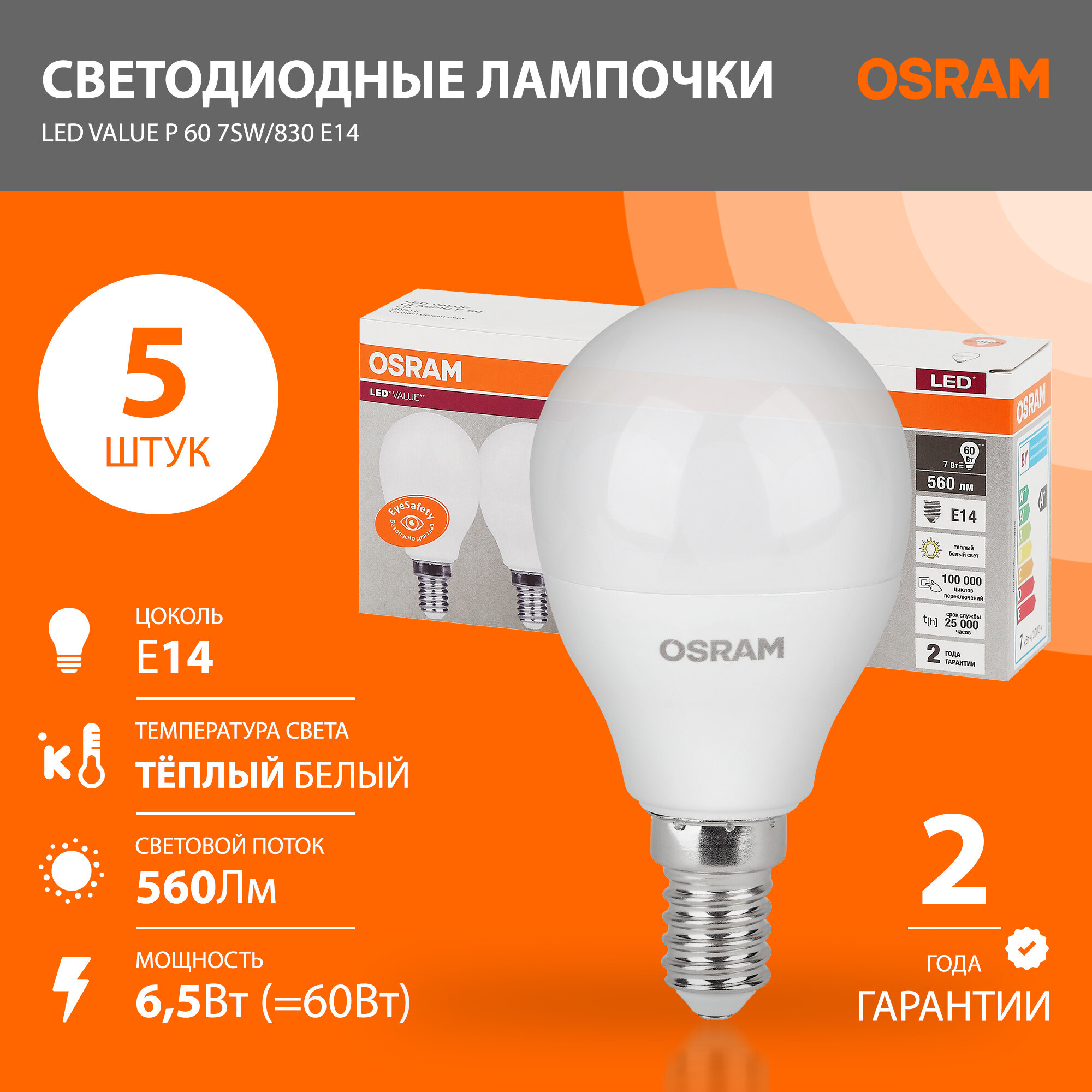 Лампа светодиодная Е14 OSRAM LED Value P, 560лм, 6.5Вт, 3000K теплый свет, 5 шт. интересное: