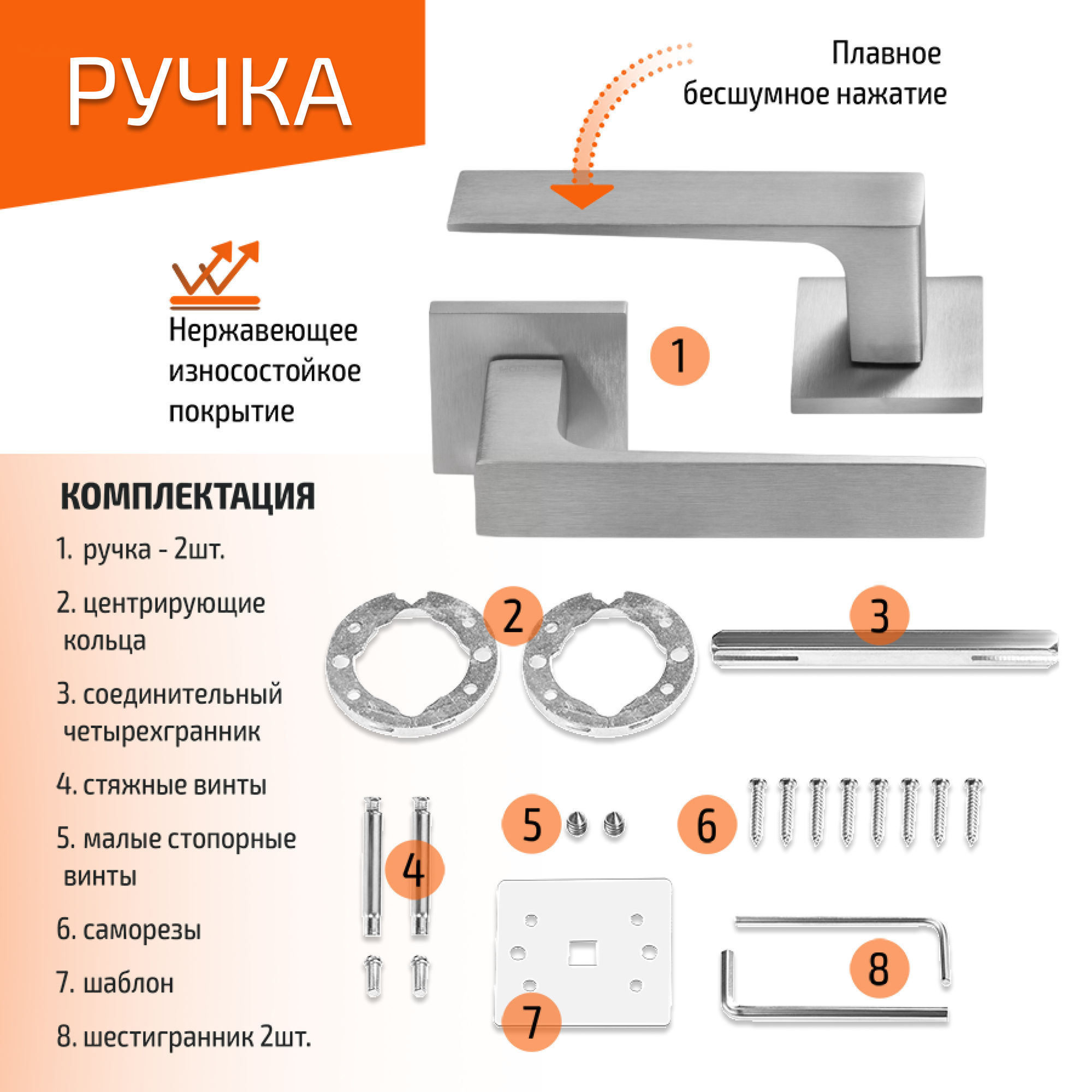 | Комплектация | Две ручки на одно дверное полотно, монтажный комплект. Подробная комплектация в описании. |