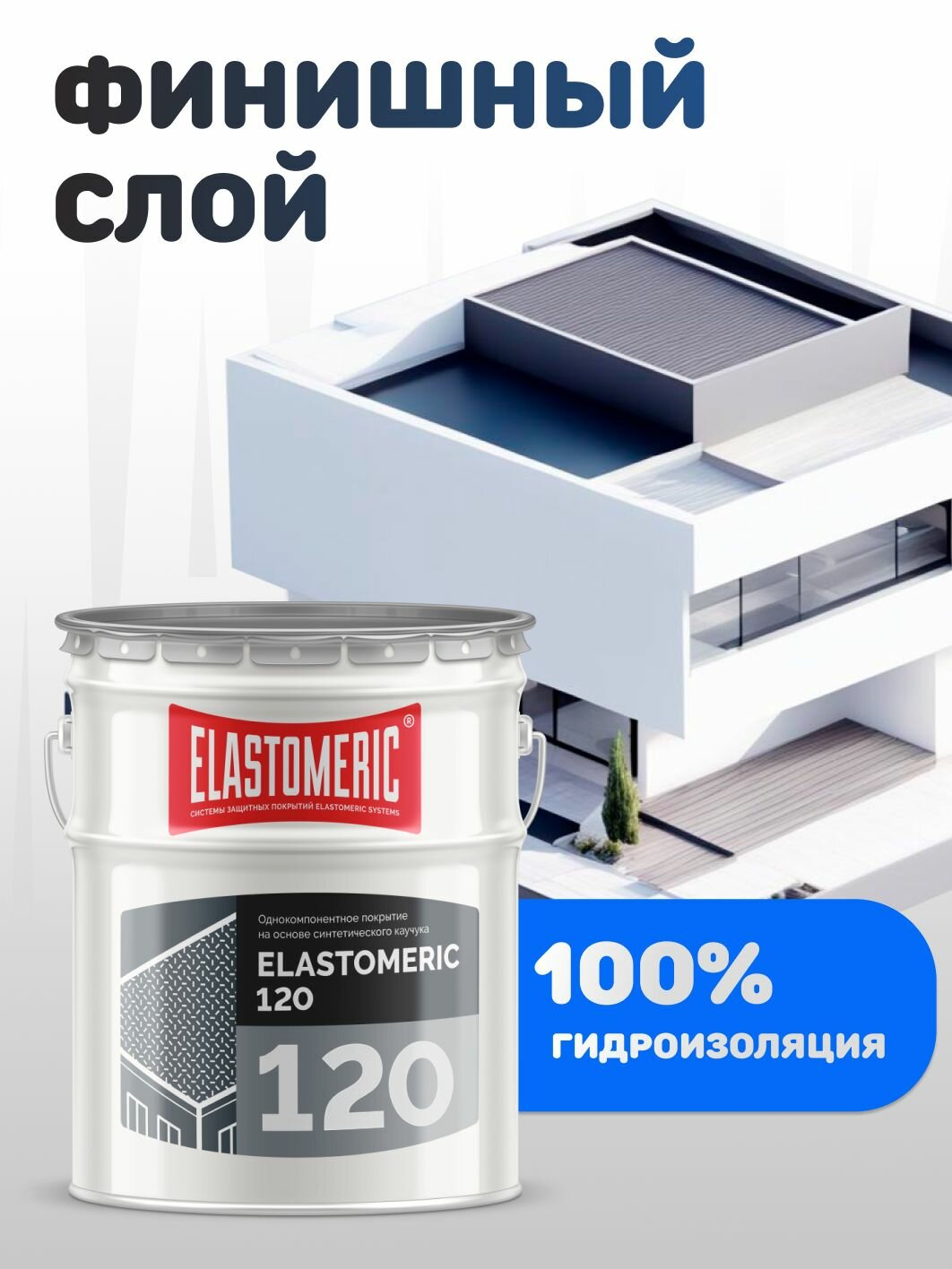 Гидроизоляция для плоской крыши ELASTOMERIC 120, мастика гидроизоляционная однокомпонентная (жидкая резина для кровли) финишный слой, серый, 20кг