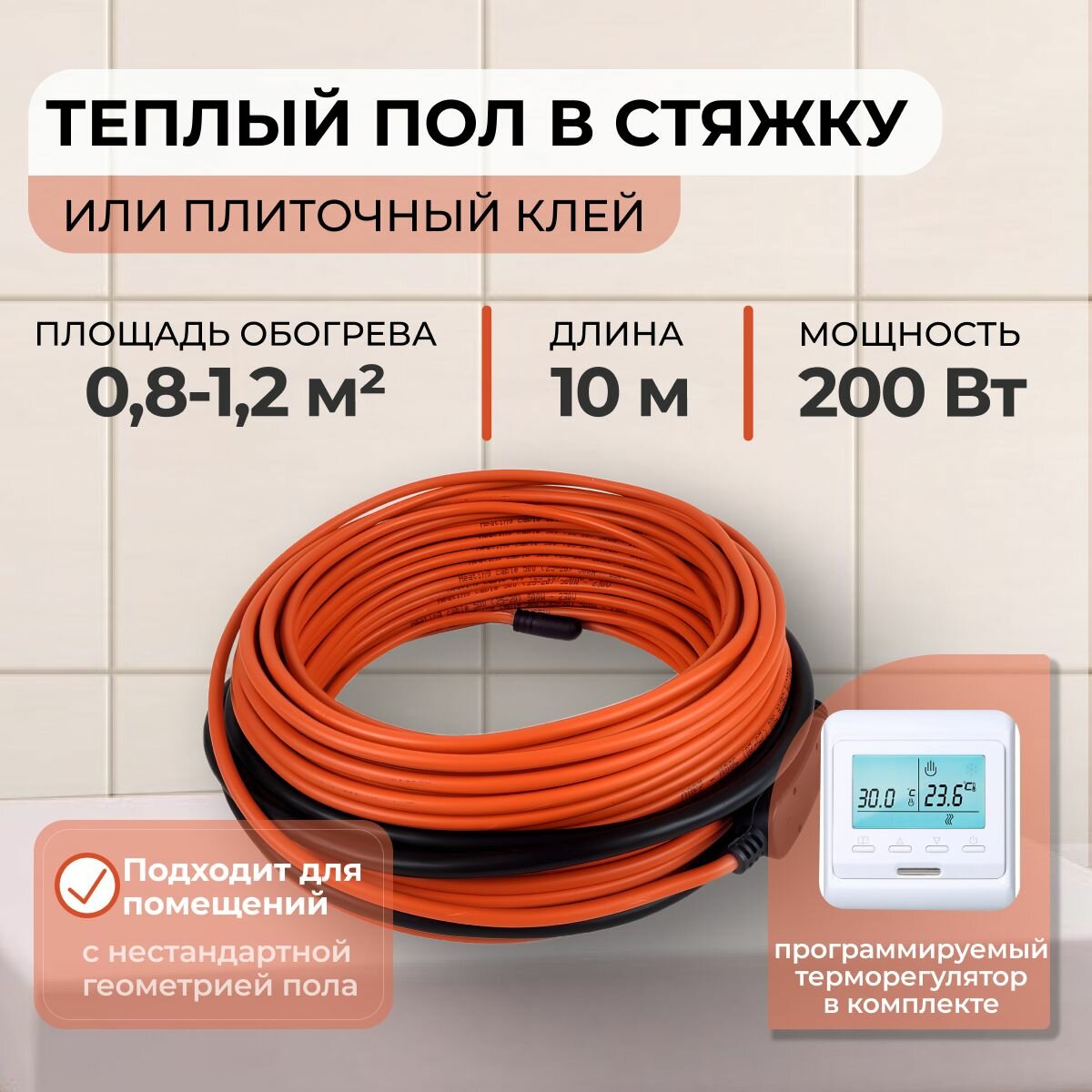 Теплый пол В стяжку или Плиточный клей 200Вт (0,8-1,2 м. кв.) с Wi-Fi терморегулятором